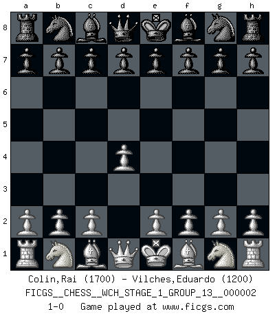Last move : 1-0 2007 February 15 22:29:16 [Event "FICGS__CHESS__WCH_STAGE_1_GROUP_13__000002"] [Site "FICGS"] [Date "2007.01.16"] [Round "1"] [White "Colin,Rai"] [Black "Vilches,Eduardo"] [Result "1-0"] [WhiteElo "1700"] [BlackElo "1200"] 1.d4 1-0 This chess game has been lost on time (started : 2007.01.16 15:24:36) Queen's pawn Player White won this chess game. Follow this game move after move (download)He who takes the Queen's Knight's Pawn will sleep in the streets. (Anonymous) Ich könnte leicht behaupten: Ja,ja, Leonid Breschnew wollte nicht, daß ich Weltmeister werde. In der Tat war die Sache komplizierter. (Viktor Kortschnoi) Aquel que teme a un Peón de Reina aislado, debería de retirarse del Ajedrez. (Siegbert Tarrasch) Si le désir cupide (et stupide) de gagner est une inépuisable source de souffrance, une combinaison brillante sur l'échiquier est une découverte : le coquelicot qui s'épanouit lorsque apparaît la Voie Lactée. (Arrabal) Gambling : The sure way of getting nothing from something. (Wilson Mizner)
