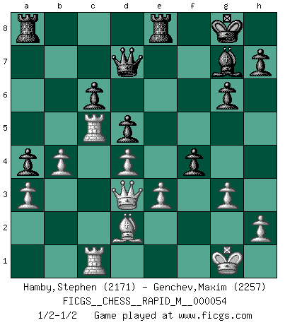 Last move : 1/2-1/2 2012 September 14 21:18:1 [Event "FICGS__CHESS__RAPID_M__000054"] [Site "FICGS"] [Date "2012.05.18"] [Round "1"] [White "Hamby,Stephen"] [Black "Genchev,Maxim"] [Result "1/2-1/2"] [WhiteElo "2171"] [BlackElo "2257"] 1.Nf3 Nf6 2.c4 c5 3.g3 Nc6 4.Bg2 g6 5.O-O Bg7 6.d4 cxd4 7.Nxd4 O-O 8.Nc3 Ng4 9.e3 d6 10.b3 Nxd4 11.exd4 Nh6 12.Bb2 Nf5 13.Nd5 Bd7 14.Ne3 Nxe3 15.fxe3 Bc6 16.Bxc6 bxc6 17.Qd3 a5 18.Bc3 a4 19.b4 d5 20.a3 e6 21.Rac1 Qd7 22.Bd2 f5 23.cxd5 exd5 24.Rc5 Rfe8 25.Rfc1 f4 1/2-1/2 Reti Opening Kingside Castling by player White (move 5) Kingside Castling by player Black (move 7) This chess game ended in a draw. Follow this game move after move (download)Chess is so inspiring that I do not believe a good player is capable of having an evil thought during the game. (Wilhelm Steinitz) Der zweitbeste Zug ist oft der einzig richtige. (Savielly Grigorievitsch Tartakower) El tablero es el mundo, las piezas es el fenomeno del universo, las reglas del juego son lo que llamamos leyes de la naturaleza y el jugador del lado opuesto, se encuentra oculto a nuestra vista. (Thomas Huxley) Même si l'adversaire joue le coup analysé précédemment, recommencez l'analyse en voyant la nouvelle position. Première règle de Blumenfeld If you are going through hell, keep going. (Winston Churchill)