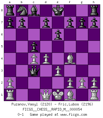 Last move : 0-1 2012 October 26 3:46:58 [Event "FICGS__CHESS__RAPID_M__000054"] [Site "FICGS"] [Date "2012.05.18"] [Round "1"] [White "Puzanov,Vasyl"] [Black "Fric,Lubos"] [Result "0-1"] [WhiteElo "2120"] [BlackElo "2196"] 1.d4 Nf6 2.c4 e6 3.Nc3 Bb4 4.Bg5 c5 5.e3 Qa5 6.Nge2 Ne4 7.Bf4 Nxc3 8.bxc3 Bxc3+ 9.Nxc3 Qxc3+ 0-1 Nimzo-Indian : Leningrad variation Player Black won this chess game. Follow this game move after move (download)Live, lose, and learn, by observing your opponent how to win. (Amber Steenbock) Wenn ich einen Club besuche, sind die Spieler stumm vor Staunen. (José Raúl Capablanca) Nos gusta pensar. (Gary Kasparov) On a dit que l'homme se distingue de l'animal par le fait qu'il achète plus de livres qu'il ne peut en lire. Je voudrais suggérer qu'inclure à la liste des livres quelques livres d'échecs rendrait la distinction manifeste. (Edward Lasker) SEO proverb : Make your website optimized for human beings, not for search engines.