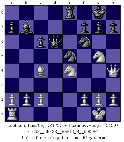 Last move : 1-0 2012 October 15 2:50:53 [Event "FICGS__CHESS__RAPID_M__000054"] [Site "FICGS"] [Date "2012.05.18"] [Round "1"] [White "Cookson,Timothy"] [Black "Puzanov,Vasyl"] [Result "1-0"] [WhiteElo "2175"] [BlackElo "2120"] 1.e4 e5 2.Nf3 Nf6 3.d4 d5 4.exd5 exd4 5.Bb5+ c6 6.dxc6 bxc6 7.Be2 Be7 8.Qxd4 O-O 9.O-O Nbd7 10.Nc3 Bb7 11.Re1 Bc5 12.Qh4 Qc7 13.Bc4 Rae8 14.Bf4 Bd6 15.Bxd6 Qxd6 16.Rxe8 Rxe8 17.Ng5 Ne5 18.Nce4 1-0 Petrov : Modern (Steinitz) attack Kingside Castling by player Black (move 8) Kingside Castling by player White (move 9) Player White won this chess game. Follow this game move after move (download)Play the opening like a book, the middle game like a magician, and the endgame like a machine. (Spielmann) Die Partien sind immer verschieden, die Interviews immer die gleichen. (Garry Kasparov) El Ajedrez no es una pizca de inferior al violín, y tenemos un gran número de violinistas profesionales. (Mikhail Botvinnik) Les ravages du H expliquent la différence de niveau entre Tal et Thal [Abergel]. I'm extremely disappointed. I send you out for exciting, new designer drugs, you come back with tomato sauce. (Gregory House, House M.D.)