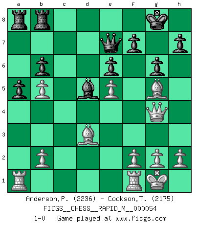 Last move : 1-0 2012 June 9 0:21:42 [Event "FICGS__CHESS__RAPID_M__000054"] [Site "FICGS"] [Date "2012.05.18"] [Round "1"] [White "Anderson,Peter W."] [Black "Cookson,Timothy"] [Result "1-0"] [WhiteElo "2236"] [BlackElo "2175"] 1.d4 Nf6 2.c4 e6 3.Nc3 Bb4 4.e3 O-O 5.Bd3 d5 6.Nf3 c5 7.O-O dxc4 8.Bxc4 Nbd7 9.Bd3 b6 10.a3 cxd4 11.exd4 Bb7 12.axb4 a6 13.Bf4 Qe7 14.b5 a5 15.Ne5 Nxe5 16.dxe5 Nd5 17.Nxd5 Bxd5 18.Be3 g6 19.Qg4 Rfb8 20.Bg5 1-0 Nimzo-Indian : 4.e3 O-O, 5.Bd3 d5 Kingside Castling by player Black (move 4) Kingside Castling by player White (move 7) Player White won this chess game. Follow this game move after move (download)A chess genius has died; a loss for humanity. (Viktor Kortchnoi, about Bobby Fischer's death) Meine Liebe ist Schach, Schach, Schach. Ich muss jeden Tag Schach spielen, deshalb fühle ich mich so stark. (Miguel Najdorf) Yo creo que el Ajedrez posee una magia que es también una ayuda en la edad avanzada. Una rodilla reumática es olvidada durante una partida de Ajedrez y otros eventos pueden parecer algo sin importancia comparada a una catástrofe en el tablero de Ajedrez. (Vlastimil Hort) Les échecs sont utiles à l'exercice de la faculté de penser et à celle de l'imagination. Car nous devons posséder une méthode élaborée pour atteindre des buts partout où nous devons conduire notre raison. (Leibnitz) Always be a first-rate version of yourself, instead of a second-rate version of somebody else. (Judy Garland)