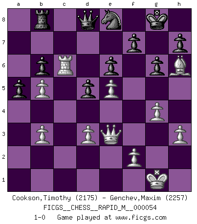Last move : 1-0 2012 October 13 9:13:35 [Event "FICGS__CHESS__RAPID_M__000054"] [Site "FICGS"] [Date "2012.05.18"] [Round "1"] [White "Cookson,Timothy"] [Black "Genchev,Maxim"] [Result "1-0"] [WhiteElo "2175"] [BlackElo "2257"] 1.e4 d6 2.d4 Nf6 3.Nc3 g6 4.Nf3 Bg7 5.Be2 O-O 6.O-O c6 7.a4 a5 8.h3 Na6 9.Be3 Nb4 10.Qd2 Qc7 11.Rac1 b6 12.Rfe1 Bb7 13.Rcd1 Rad8 14.Bg5 Rfe8 15.Bc4 d5 16.exd5 cxd5 17.Bd3 Nxd3 18.cxd3 Ba6 19.Qe3 Nh5 20.g4 Nf6 21.Bf4 Qb7 22.Rc1 Rc8 23.Nb5 Bxb5 24.axb5 e6 25.Ne5 Rxc1 26.Rxc1 Ra8 27.Bh6 Bh8 28.Qf4 Ne8 29.Kg2 Bxe5 30.dxe5 Rc8 31.Kg1 Rb8 32.Rc6 Qe7 33.Qe3 Qd8 34.b3 1-0 Pirc : Classical system, 5.Be2 Kingside Castling by player Black (move 5) Kingside Castling by player White (move 6) Player White won this chess game. Follow this game move after move (download)Bobby is the most misunderstood, misquoted celebrity walking the face of this earth. (Yasser Seirawan) Fischer: 'Remis!?' Uhlmann: 'Aber es muss doch dreimal Zugwiederholung sein!' Fischer: 'Sie nehmen das Remis an, wie ich es sage, sonst spiele ich weiter und werde Sie dann schlagen!' (Robert James Fischer) Personalmente, yo prefiero mirar hacia el futuro en donde un programa de computadora gane el título mundial de Ajedrez. La humanidad necesita una lección de humildad. (Richard Dawkings) Avant la finale, les dieux ont créé le milieu de partie. (Tarrasch) The only thing that overcomes hard luck is hard work. (Harry Golden)