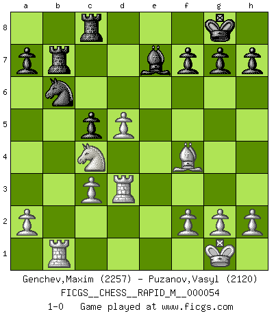 Last move : 1-0 2012 September 25 21:41:57 [Event "FICGS__CHESS__RAPID_M__000054"] [Site "FICGS"] [Date "2012.05.18"] [Round "1"] [White "Genchev,Maxim"] [Black "Puzanov,Vasyl"] [Result "1-0"] [WhiteElo "2257"] [BlackElo "2120"] 1.d4 d5 2.c4 Nc6 3.Nc3 Nf6 4.Nf3 Bf5 5.cxd5 Nxd5 6.Qb3 Nxc3 7.bxc3 Qd7 8.Qxb7 Rb8 9.Qa6 Rb6 10.Qa4 e6 11.e3 Be7 12.Nd2 O-O 13.e4 Bg6 14.Bd3 Ne5 15.Qxd7 Nxd7 16.O-O c5 17.Nc4 Rb7 18.Rd1 Rfb8 19.Bf4 Rc8 20.d5 exd5 21.exd5 Bxd3 22.Rxd3 Nb6 23.Rb1 1-0 QGD : Chigorin defense Kingside Castling by player Black (move 12) Kingside Castling by player White (move 16) Player White won this chess game. Follow this game move after move (download)Chess is the gymnasium of the mind. (Blaise Pascal) Obwohl ich vom Stil her kaum zu den Priestern der Schachkunst gezählt werde, halte ich Schach doch für eine Kunst. (Tigran Petrosjan) El poder defensivo de una pieza clavada, solamente es imaginario. (Aaron Nimzovich) Le moment que je préfère le plus dans une rencontre, c'est celui où je sens que la personnalité de l'adversaire se brise. (Robert Fischer) If you lose the game you should win the analysis! (Proverb)