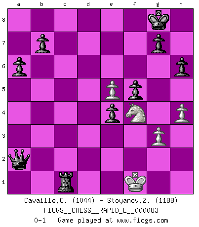 Last move : 0-1 2012 May 20 20:45:34 [Event "FICGS__CHESS__RAPID_E__000083"] [Site "FICGS"] [Date "2012.05.19"] [Round "1"] [White "Cavaille,Cedric"] [Black "Stoyanov,Zdravko"] [Result "0-1"] [WhiteElo "1044"] [BlackElo "1188"] 1.e4 c5 2.Nf3 a6 3.Bc4 e6 4.a3 h6 5.c3 Be7 6.b4 Nc6 7.bxc5 Bxc5 8.a4 Qf6 9.Ba3 Bb6 10.d4 Nge7 11.Nbd2 O-O 12.e5 Qg6 13.Rb1 Ba5 14.Bb2 Nf5 15.Ra1 Qxg2 16.Ke2 Qg4 17.Qg1 Qf4 18.Qg3 Nxg3+ 19.fxg3 Qg4 20.Kf2 Ne7 21.Bd3 Nd5 22.Be4 Bxc3 23.Bxc3 Nxc3 24.Rhe1 f5 25.Bd3 Rd8 26.Bc4 d5 27.Ra3 Ne4+ 28.Nxe4 dxe4 29.Ng1 Rxd4 30.Be2 Qg5 31.Rd3 Rxd3 32.Bxd3 Bd7 33.h4 Qe7 34.Bc2 Qc5+ 35.Kf1 Qxc2 36.Re2 Qxa4 37.Nh3 Bb5 38.Nf4 Bxe2+ 39.Kxe2 Rc8 40.Nxe6 Rc3 41.Nf4 Qa2+ 42.Kf1 Rc1+ 0-1 Sicilian : O'Kelly variation Kingside Castling by player Black (move 11) Player Black won this chess game. Follow this game move after move (download)There's never before been a Chess player with such a thorough knowledge of the intricacies of the game and such an absolutely indomitable will to win. I think Bobby is the greatest player that ever lived. (Lisa Lane) Im Fernschach kannst du während dem Spiel rauchen. (John Christen Knudsen) La partida mas dura de ganar es una partida ganada. (Emanuel Lasker) Il (Jacob Murray) ne joue pas pour le bon coup, mais pour le meilleur. (Eloi Relange) Before all elsed, be armed. (Niccolo Machiavelli)