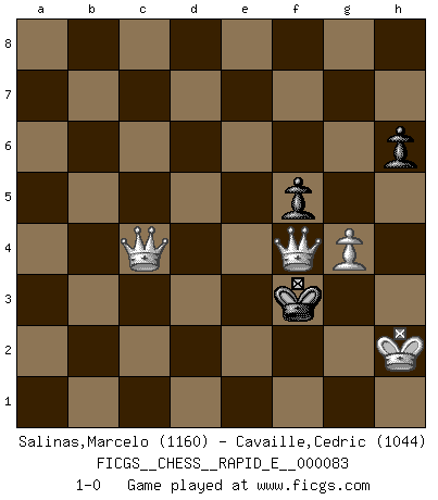 Last move : 1-0 2012 October 23 16:25:31 [Event "FICGS__CHESS__RAPID_E__000083"] [Site "FICGS"] [Date "2012.05.19"] [Round "1"] [White "Salinas,Marcelo"] [Black "Cavaille,Cedric"] [Result "1-0"] [WhiteElo "1160"] [BlackElo "1044"] 1.Nc3 g6 2.e4 Bg7 3.Nd5 d6 4.Qf3 c6 5.Nf4 Nf6 6.Ngh3 Bxh3 7.Qxh3 O-O 8.Bd3 Qd7 9.Qe3 b5 10.O-O a6 11.a4 bxa4 12.Rxa4 c5 13.h3 Qxa4 14.Nd5 Nxd5 15.exd5 Qd4 16.Qxe7 Qf6 17.Qb7 a5 18.Qxa8 Qd8 19.Qb7 Qd7 20.Qb3 Qc7 21.Bc4 Nd7 22.f4 Qb6 23.Qa4 Nf6 24.b3 Qb4 25.Qc6 Ne4 26.Re1 Nxd2 27.Qxd6 Nxc4 28.Qe7 a4 29.bxc4 Qxc4 30.d6 Qd4+ 31.Kh2 Qf6 32.d7 Qxe7 33.Rxe7 Bf6 34.Re8 Kg7 35.Ba3 Bd8 36.Bxc5 Rg8 37.Bd4+ f6 38.g4 Kf7 39.Rxg8 Kxg8 40.c4 a3 41.c5 Kf7 42.c6 Ke7 43.Bc5+ Ke6 44.Bxa3 Kd5 45.Be7 Bxe7 46.c7 Bd6 47.d8Q f5 48.c8Q fxg4 49.hxg4 Ke4 50.Qxd6 h6 51.f5 gxf5 52.Qc4+ Kf3 53.Qd6f4+ 1-0 Dunst (Sleipner, Heinrichsen) Opening Kingside Castling by player Black (move 7) Kingside Castling by player White (move 10) Promotion Queen by player White (move 47) Promotion Queen by player White (move 48) 10 pieces endgame at move 48 : White KQQPP , Black KBPPP WHITE : King + 2 Queens 2 Pawns BLACK : King + 1 Bishop 3 Pawns 9 pieces endgame at move 49 : White KQQPP , Black KBPP WHITE : King + 2 Queens 2 Pawns BLACK : King + 1 Bishop 2 Pawns 8 pieces endgame at move 50 : White KQQPP , Black KPP WHITE : King + 2 Queens 2 Pawns BLACK : King + 2 Pawns 7 pieces endgame at move 51 : White KQQP , Black KPP WHITE : King + 2 Queens 1 Pawn BLACK : King + 2 Pawns Player White won this chess game. Follow this game move after move (download)All I want to do, ever, is just play Chess. (Bobby Fischer) Ein typischer, sehr verbreiteter Gedankenschädling ist der, daß der betreffende Amateur von der Annanhme ausgeht, daß jeder einzelne Zug etwas zu leisten habe. (Aaron Nimzowitsch) Cuando me preguntan: -¿Cual es el secreto que te hace hacer mejores movidas que tus oponentes?, Yo respondo: Me da gusto que me pregunten eso, porque, como veran, hay una simple razón. Yo pienso mis propias movidas y dejo a mi oponente que el piense las suyas. (Alexander Alekhine) La menace est plus forte que l'exécution. (Aaron Nimzovitch) Those parts of the system that you can hit with a hammer (not advised) are called hardware; those program instructions that you can only curse at are called software. (Anonymous)