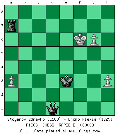 Last move : 0-1 2012 May 23 7:12:1 [Event "FICGS__CHESS__RAPID_E__000083"] [Site "FICGS"] [Date "2012.05.19"] [Round "1"] [White "Stoyanov,Zdravko"] [Black "Bromo,Alexis"] [Result "0-1"] [WhiteElo "1188"] [BlackElo "1229"] 1.e4 e5 2.Nf3 Nc6 3.Bb5 d6 4.Bxc6+ bxc6 5.h3 Bb7 6.a3 Nf6 7.d3 Qe7 8.Bg5 h6 9.Bxf6 Qxf6 10.c3 d5 11.O-O O-O-O 12.Re1 d4 13.cxd4 exd4 14.e5 Qe6 15.Qa4 c5 16.Qxa7 g5 17.Nh2 Qd5 18.f3 h5 19.Re4 g4 20.fxg4 hxg4 21.Nxg4 Be7 22.Nd2 Bg5 23.Nc4 Rde8 24.Na5 f5 25.exf6 Rxe4 26.dxe4 Qxe4 27.Qxb7+ Qxb7 28.Nxb7 Kxb7 29.f7 Rf8 30.Ne5 Bf4 31.Re1 c6 32.Re4 Bxe5 33.Rxe5 Rxf7 34.Rxc5 d3 35.Rc1 Kb6 36.Rd1 Rd7 37.b3 c5 38.Kf2 Kb5 39.Ke3 c4 40.bxc4+ Kxc4 41.Rd2 Kc3 42.g4 Re7+ 43.Kf4 Kxd2 44.Kf5 Ke3 45.Kf6 Ra7 46.g5 d2 47.g6 d1Q 0-1 Ruy Lopez : Old Steinitz defense Kingside Castling by player White (move 11) Queenside Castling by player Black (move 11) 10 pieces endgame at move 34 : White KRPPPP , Black KRPP WHITE : King + 1 Rook 4 Pawns BLACK : King + 1 Rook 2 Pawns 9 pieces endgame at move 40 : White KRPPPP , Black KRP WHITE : King + 1 Rook 4 Pawns BLACK : King + 1 Rook 1 Pawn 8 pieces endgame at move 40 : White KRPPP , Black KRP WHITE : King + 1 Rook 3 Pawns BLACK : King + 1 Rook 1 Pawn 7 pieces endgame at move 43 : White KPPP , Black KRP WHITE : King + 3 Pawns BLACK : King + 1 Rook 1 Pawn Promotion Queen by player Black (move 47) Player Black won this chess game. Follow this game move after move (download)A strong memory, concentration, imagination, and a strong will is required to become a great Chess player. (Bobby Fischer) Frage: Gibt es etwas was Sie mehr lieben als Autobahnen ohne Tempobegrenzungen? - Antwort: Deutsche Frauen ohne Tempobegrenzungen. (Loek van Wely) Uno por uno, yo los acribillé, mi superioridad muy pronto se volvio aparente. (Jose Capablanca) Plusieurs personnes se sont demandées comment Tal faisait pour gagner... En fait, c'est très simple ! Il met ses pièces au centre de l'échiquier et les sacrifie quelque part ! (David Bronstein) Internal peace cannot coexist with external war. (Don Groves)