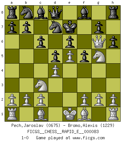 Last move : 1-0 2012 September 2 10:46:39 [Event "FICGS__CHESS__RAPID_E__000083"] [Site "FICGS"] [Date "2012.05.19"] [Round "1"] [White "Pech,Jaroslav"] [Black "Bromo,Alexis"] [Result "1-0"] [WhiteElo "0675"] [BlackElo "1229"] 1.e4 c6 2.d4 d5 3.Nc3 Nf6 4.e5 Nfd7 5.Qf3 e6 6.Qg3 f5 7.Nf3 h6 8.Qg6+ Ke7 9.Ng5 1-0 Caro-Kann defense Player White won this chess game. Follow this game move after move (download)There just isn't enough televised Chess. (David Letterman) Kein Großmeister ist normal. Sie unterscheiden sich nur im Ausmaß Ihrer Verrücktheit. (Viktor Kortschnoi) Un sacrificio se refuta mucho mejor al aceptarlo. (Wilhelm Steinitz) Il n'y a pas eu de défaite parce que je ne crois pas que cet ordinateur ait jamais existé. IBM a triché en refusant d'imprimer les modes de recherche de la machine. C'est évident, pendant le match, des coups décisifs ont été joués par des êtres humains. Aujourd'hui, les meilleurs spécialistes en informatique ne peuvent toujours pas expliquer comment Deep-Blue a pu jouer contre la logique des ordinateurs. IBM a gagné une guerre de communication, mais ils sont incapables de prouver que l'ordinateur a gagné tout seul. (Garry Kasparov) The Movers & Shakers of this world are those who play chess in the mornings and go to the disco in the evenings. (Dinesh De Silva)
