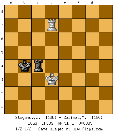 Last move : 1/2-1/2 2012 December 5 1:32:24 [Event "FICGS__CHESS__RAPID_E__000083"] [Site "FICGS"] [Date "2012.05.19"] [Round "1"] [White "Stoyanov,Zdravko"] [Black "Salinas,Marcelo"] [Result "1/2-1/2"] [WhiteElo "1188"] [BlackElo "1160"] 1.e4 Nc6 2.Nf3 e5 3.Bb5 Nd4 4.Nxd4 exd4 5.d3 Bb4+ 6.Bd2 Qg5 7.c3 Qxg2 8.Rf1 dxc3 9.Bxc3 Qg5 10.Bc4 Qe5 11.Qf3 Nf6 12.a3 Bxc3+ 13.bxc3 d5 14.d4 Qxe4+ 15.Qxe4+ Nxe4 16.Bxd5 Nd6 17.Nd2 O-O 18.O-O-O c6 19.Bf3 Nb5 20.Ne4 Nxa3 21.Nc5 Bf5 22.Kb2 Nc4+ 23.Kb3 Nd6 24.Kb4 a5+ 25.Ka4 b5+ 26.Kb3 a4+ 27.Ka2 Be6+ 28.Nxe6 fxe6 29.Bxc6 Rac8 30.Bd7 Rxc3 31.Bxe6+ Kh8 32.f4 Rc2+ 33.Kb1 Rxh2 34.f5 a3 35.Ka1 Nc4 36.Bxc4 bxc4 37.Rc1 Rb8 38.Rxc4 a2 39.Rfc1 Kg8 40.d5 Rb1+ 41.Rxb1 axb1Q+ 42.Kxb1 Kf7 43.Rc6 Rh1+ 44.Kc2 Ke7 45.Kd3 Rh4 46.Ra6 Rf4 47.Ra7+ Kd6 48.Rxg7 Kxd5 49.Rxh7 Rf3+ 50.Ke2 Rxf5 51.Rd7+ Kc4 52.Ke3 Re5+ 53.Kf4 Re6 54.Kf5 Rc6 55.Ke5 Rc5+ 56.Ke4 Kb4 57.Kd4 Rc4+ 58.Kd3 1/2-1/2 KP : Nimzovich defense Kingside Castling by player Black (move 17) Queenside Castling by player White (move 18) 10 pieces endgame at move 41 : White KRRPP , Black KRPPP WHITE : King + 2 Rooks 2 Pawns BLACK : King + 1 Rook 3 Pawns Promotion Queen by player Black (move 41) 9 pieces endgame at move 41 : White KRPP , Black KQRPP WHITE : King + 1 Rook 2 Pawns BLACK : King + 1 Queen 1 Rook 2 Pawns 8 pieces endgame at move 42 : White KRPP , Black KRPP WHITE : King + 1 Rook 2 Pawns BLACK : King + 1 Rook 2 Pawns 7 pieces endgame at move 48 : White KRPP , Black KRP WHITE : King + 1 Rook 2 Pawns BLACK : King + 1 Rook 1 Pawn 6 pieces endgame at move 48 : White KRP , Black KRP WHITE : King + 1 Rook 1 Pawn BLACK : King + 1 Rook 1 Pawn 5 pieces endgame at move 49 : White KRP , Black KR WHITE : King + 1 Rook 1 Pawn BLACK : King + 1 Rook 4 pieces endgame at move 50 : White KR , Black KR WHITE : King + 1 Rook BLACK : King + 1 Rook This chess game ended in a draw. Follow this game move after move (download)Nonsense was the last thing Fischer was interested in, as far as Chess was concerned. (Elie Agur) Alles was am Schachbrett zählt sind gute Züge. (Robert James Fischer) La única cosa que los jugadores de Ajedrez tienen en común, es el Ajedrez. (Lodewijk Prins) 'L'échange des dames est un coup dur pour les deux adversaires...' Un journaliste lors d'une partie du match Spassky-Fischer I would love to change the world, but they won't give me the source code. (Unknown)