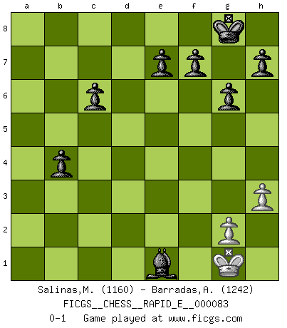Last move : 0-1 2012 September 21 18:18:46 [Event "FICGS__CHESS__RAPID_E__000083"] [Site "FICGS"] [Date "2012.05.19"] [Round "1"] [White "Salinas,Marcelo"] [Black "Barradas,Anderson"] [Result "0-1"] [WhiteElo "1160"] [BlackElo "1242"] 1.e4 c6 2.Nf3 d5 3.Ne5 Be6 4.Qh5 g6 5.Qf3 Nf6 6.d4 dxe4 7.Qe3 Bg7 8.Bc4 Bxc4 9.Nxc4 Qd5 10.Nbd2 O-O 11.O-O Nbd7 12.Ne5 Nxe5 13.dxe5 Ng4 14.Qf4 Nxe5 15.Nxe4 Rad8 16.Be3 Rd6 17.Rad1 Qxd1 18.Nxd6 Qxd6 19.Bxa7 Ra8 20.Qe3 Nc4 21.Qe2 Nxb2 22.c3 Bxc3 23.Be3 Rxa2 24.Rd1 Nxd1 25.Qxa2 Nxe3 26.fxe3 Qd2 27.Qb1 Qxe3+ 28.Kh1 b5 29.h3 Qe1+ 30.Qxe1 Bxe1 31.Kg1 b4 0-1 Caro-Kann defense Kingside Castling by player Black (move 10) Kingside Castling by player White (move 11) Player Black won this chess game. Follow this game move after move (download)I feel as if I were a piece in a game of Chess, when my opponent says of it: That piece cannot be moved. (Soren Kierkegaard) Je mehr ich von der FIDE weiss, um so weniger verstehe ich. (Alexander Kalifman) Los finales de Peón son del Ajedrez lo que el cesped es del Golf. (Cecil Purdy) Toute estimation doit être constamment réévaluée. (Jacob Estrin) You think that education is too expensive ? Try ignorance. (Derek Bok)