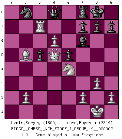 Last move : 1-0 2007 April 17 10:7:46 [Event "FICGS__CHESS__WCH_STAGE_1_GROUP_14__000002"] [Site "FICGS"] [Date "2007.01.16"] [Round "1"] [White "Uzdin,Sergey"] [Black "Louro,Eugenio"] [Result "1-0"] [WhiteElo "1800"] [BlackElo "2214"] 1.e4 Nf6 2.e5 Nd5 3.d4 d6 4.Nf3 Bg4 5.Be2 e6 6.O-O a6 7.c4 Nb6 8.exd6 cxd6 9.d5 e5 10.a4 Bxf3 11.Bxf3 Nxc4 12.Be2 Nb6 13.a5 Nc8 14.Qb3 b5 15.axb6 Nxb6 16.Be3 N8d7 17.Rc1 Nc5 18.Bxc5 dxc5 19.Bxa6 Nd7 20.Nd2 Be7 21.Bb5 Rxa1 22.Rxa1 O-O 23.d6 Bg5 24.Ne4 Bh4 25.Bc6 Kh8 26.g3 Nb8 27.Bb5 Bg5 28.Qd5 Bf6 29.Ra7 Kg8 30.Rc7 1-0 Alekhine's defense : Modern variation, 4...Bg4 Kingside Castling by player White (move 6) Kingside Castling by player Black (move 22) Player White won this chess game. Follow this game move after move (download)The enormous mental resilience, without which no Chess player can exist, was so much taken up by Chess that he could never free his mind of this game. (Albert Einstein) Kostenjuk hat keinen Sexappeal. (Loek van Wely) Después de una mala apertura, hay una esperanza en el juego medio. Pero una vez que estas en finales, el momento de la verdad ha llegado. (Edmar Mednis) On peut tirer plus d'utilité d'une partie perdue que de 100 parties gagnées. (Capablanca) Computers make it easier to do a lot of things, but most of the things they make it easier to do don't need to be done. (Andy Rooney)