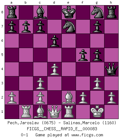 Last move : 0-1 2012 October 28 8:52:14 [Event "FICGS__CHESS__RAPID_E__000083"] [Site "FICGS"] [Date "2012.05.19"] [Round "1"] [White "Pech,Jaroslav"] [Black "Salinas,Marcelo"] [Result "0-1"] [WhiteElo "0675"] [BlackElo "1160"] 1.e4 e6 2.d4 Qh4 3.Nc3 Bb4 4.Bd3 Nc6 5.Nf3 Bxc3+ 6.bxc3 Qg4 7.O-O h6 8.Rb1 f5 9.exf5 exf5 10.Re1+ Nce7 11.Be2 d6 12.Ng5 Qh4 13.g3 hxg5 0-1 French defense Kingside Castling by player White (move 7) Player Black won this chess game. Follow this game move after move (download)You sit at the board and suddenly your heart leaps. Your hand trembles to pick up the piece and move it. But what Chess teaches you is that you must sit there calmly and think about whether it's really a good idea and whether there are other better ideas. (Stanley Kubrick) Moralische Siege zählen nicht. (Savielly Grigorievitsch Tartakower) El ganador de una partida es aquel jugador que hace el penúltimo error. (Savielly Tartakover) Les sacrifices démontrent seulement que quelqu'un a gaffé. (Savielly Tartacover) The real voyage of discovery consists not in seeking new lands but in seeing with new eyes. (Marcel Proust)