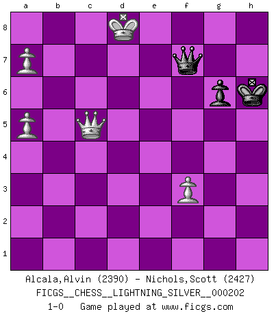 Last move : 1-0 2012 May 20 22:38:1 [Event "FICGS__CHESS__LIGHTNING_SILVER__000202"] [Site "FICGS"] [Date "2012.05.20"] [Round "1"] [White "Alcala,Alvin"] [Black "Nichols,Scott"] [Result "1-0"] [WhiteElo "2390"] [BlackElo "2427"] 1.e4 c5 2.Nf3 d6 3.d4 cxd4 4.Nxd4 Nf6 5.Nc3 a6 6.Be3 e5 7.Nb3 Be6 8.f3 Be7 9.Qd2 Nbd7 10.g4 O-O 11.O-O-O b5 12.a3 Nb6 13.g5 Nh5 14.Na5 Qc7 15.Kb1 g6 16.h4 Rab8 17.Rh2 Nc4 18.Nxc4 bxc4 19.Ka1 Qb7 20.Rb1 Rfd8 21.Nd5 Rdc8 22.Bh3 Re8 23.Nxe7+ Qxe7 24.Bg4 Rec8 25.c3 Rd8 26.Qe2 d5 27.exd5 Rxd5 28.Bxe6 Qxe6 29.Qxc4 Rbd8 30.Qa4 Ng7 31.Re1 Nf5 32.Bc1 Ng3 33.Bf4 Nh5 34.Be3 R8d7 35.c4 Rd3 36.Rc2 Rd8 37.Qa5 Re8 38.Rc3 Rd7 39.Qa4 Rc8 40.Bb6 Rd6 41.c5 Rd4 42.Qxa6 Nf4 43.Rce3 Rb8 44.Rxe5 Qb3 45.R5e3 Nd3 46.Rb1 Rc4 47.c6 Rxc6 48.Rxd3 Qe6 49.Rbd1 Rcxb6 50.Qa5 Qe7 51.Rd7 Qe3 52.R7d3 Qe7 53.Qd2 Re8 54.Rd8 Rb8 55.Rxb8 Rxb8 56.Qc3 Ra8 57.Rd4 Qe6 58.a4 Rc8 59.Qd2 h5 60.gxh6 Kh7 61.a5 Qb3 62.Rd3 Qa4+ 63.Ra3 Qc4 64.a6 Qf1+ 65.Ka2 Qc4+ 66.b3 Qc5 67.a7 Ra8 68.b4 Qe7 69.Qd4 Qe6+ 70.Kb1 Qe1+ 71.Kc2 Qe2+ 72.Kc1 Qe1+ 73.Kb2 Qe2+ 74.Kb3 Kxh6 75.Qc3 Qe6+ 76.Kb2 Kh7 77.h5 Qe7 78.Qd4 Qe2+ 79.Kb3 Re8 80.hxg6+ fxg6 81.Qd7+ Kh6 82.Ra5 Re3+ 83.Ka4 Qa2+ 84.Kb5 Re5+ 85.Kb6 Rxa5 86.bxa5 Qf2+ 87.Kb5 Qb2+ 88.Kc5 Qc3+ 89.Kb6 Qe3+ 90.Kb5 Qb3+ 91.Ka6 Qc4+ 92.Kb6 Qb4+ 93.Qb5 Qd4+ 94.Qc5 Qd8+ 95.Kb5 Qe8+ 96.Qc6 Qe2+ 97.Kb6 Qe3+ 98.Qc5 Qe6+ 99.Kc7 Qf7+ 100.Kd8 1-0 Sicilian : Najdorf, Byrne (English) attack Kingside Castling by player Black (move 10) Queenside Castling by player White (move 11) 10 pieces endgame at move 80 : White KQRPPP , Black KQRP WHITE : King + 1 Queen 1 Rook 3 Pawns BLACK : King + 1 Queen 1 Rook 1 Pawn 9 pieces endgame at move 85 : White KQPPP , Black KQRP WHITE : King + 1 Queen 3 Pawns BLACK : King + 1 Queen 1 Rook 1 Pawn 8 pieces endgame at move 86 : White KQPPP , Black KQP WHITE : King + 1 Queen 3 Pawns BLACK : King + 1 Queen 1 Pawn Player White won this chess game. Follow this game move after move (download)It is not a move, even the best move that you must seek, but a realizable plan. (Eugene Znosko-Borovsky) Ich bin stolz ein Bulgare zu sein. (Veselin Topalov) La señal de un Gran Maestro es su habilidad de ganar una partida rápidamente y sin dolor. (Irving Chernev) Aucun coup ne doit être joué sans but. (Pedro Damiano) Imagination is more important than knowledge. Knowledge is limited. Imagination encircles the world. (Albert Einstein)