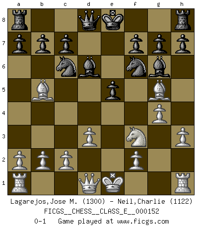 Last move : 0-1 2012 November 19 10:53:26 [Event "FICGS__CHESS__CLASS_E__000152"] [Site "FICGS"] [Date "2012.05.20"] [Round "1"] [White "Lagarejos,Jose M."] [Black "Neil,Charlie"] [Result "0-1"] [WhiteElo "1300"] [BlackElo "1122"] 1.e4 e5 2.Nf3 Nc6 3.Nc3 Nf6 4.Bc4 d5 5.Bd3 dxe4 6.Nxe4 Bg4 7.h3 Bh5 8.g4 Bg6 9.Bb5 Bxe4 10.d3 Bg6 11.Bg5 Bd6 0-1 This chess game has been lost on time (started : 2012.05.20 23:12:49) Four knights : Italian variation Player Black won this chess game. Follow this game move after move (download)Of all my Russian books, the defense contains and diffuses the greatest 'warmth' which may seem odd seeing how supremely abstract Chess is supposed to be. (Vladimir Nabokov) Schach ist Kampf, hauptsächlich jedoch gegen die eigenen Fehler. (Savielly Grigorievitsch Tartakower) Yo jugué Ajedrez con el y a veces le pude haber ganado solo que siempre devuelve su última jugada y juega la partida de manera diferente. (Mark Twain) Les erreurs sont comme les malheurs, elles n'arrivent jamais seules. (Siegbert Tarrasch) Treat your password like your toothbrush. Don't let anybody else use it, and get a new one every six months. (Clifford Stoll)