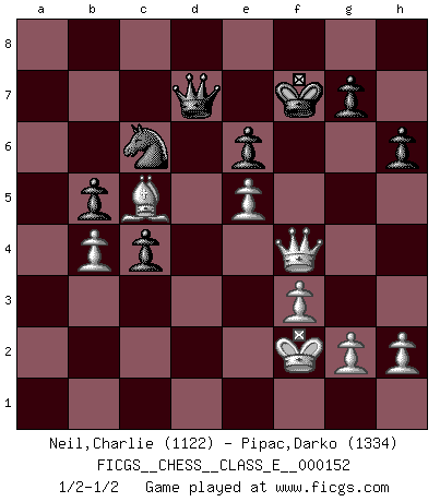Last move : 1/2-1/2 2012 August 28 23:22:44 [Event "FICGS__CHESS__CLASS_E__000152"] [Site "FICGS"] [Date "2012.05.20"] [Round "1"] [White "Neil,Charlie"] [Black "Pipac,Darko"] [Result "1/2-1/2"] [WhiteElo "1122"] [BlackElo "1334"] 1.Nf3 d5 2.d4 h6 3.c4 c6 4.Nc3 Bg4 5.Ne5 Nf6 6.Nxg4 Nxg4 7.e3 Nf6 8.Bd3 e6 9.O-O a6 10.b3 b5 11.Bb2 Bd6 12.cxd5 cxd5 13.Rc1 O-O 14.Re1 Bb4 15.a3 Bxc3 16.Rxc3 Qb6 17.b4 Nbd7 18.Qe2 Rac8 19.Rec1 Rxc3 20.Rxc3 a5 21.f3 axb4 22.axb4 Ra8 23.Ra3 Rxa3 24.Bxa3 Qa6 25.Qb2 Ne8 26.Qc3 Nd6 27.e4 Nc4 28.Bxc4 dxc4 29.Bb2 f6 30.e5 fxe5 31.dxe5 Qb6+ 32.Kf1 Kf7 33.Qd2 Nb8 34.Qf4+ Kg8 35.Bd4 Qc7 36.Bc5 Qf7 37.Qd4 Nc6 38.Qd6 Qe8 39.Kf2 Kf7 40.Qd2 Kg6 41.Qc2+ Kf7 42.Qe4 Qd7 43.Qf4+ Kg6 44.Qe4+ Kf7 45.Qf4+ 1/2-1/2 Reti Opening Kingside Castling by player White (move 9) Kingside Castling by player Black (move 13) This chess game ended in a draw. Follow this game move after move (download)The most powerful weapon in Chess is to have the next move. (David Bronstein) Ja, ich habe einmal eine Blitzpartie gespielt, es war in einem Zug, 1929. --im Interview 1989 (Mikhail Moiseyevich Botvinik) Si tu oponente te ofrece un empate, trata de averiguar porque piensa él que esta en una posición peor. (Nigel Short) Echiquier : carré parfait, comme la Jérusalem nouvelle décrite par l'auteur de l'Apocalypse, huit cases sur huit, exaltation du chiffre 4, symbole du cosmos aux quatre horizons... où le noir et le blanc, l'ombre et la lumière, le mal et le bien s'entremêlent et se conjuguent. (Robert Couffignal, Le Gambit du poète) Inventor: A person who makes an ingenious arrangement of wheels, levers and springs, and believes it civilization. (Ambrose Bierce, The Devil's Dictionary)
