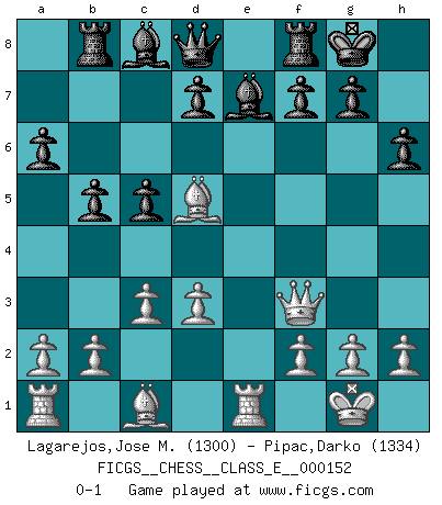 Last move : 0-1 2012 October 16 21:57:59 [Event "FICGS__CHESS__CLASS_E__000152"] [Site "FICGS"] [Date "2012.05.20"] [Round "1"] [White "Lagarejos,Jose M."] [Black "Pipac,Darko"] [Result "0-1"] [WhiteElo "1300"] [BlackElo "1334"] 1.e4 c5 2.Nc3 e5 3.Nf3 Nc6 4.Bc4 Nf6 5.O-O b6 6.Re1 a6 7.d3 h6 8.Nd5 b5 9.Bb3 Nxd5 10.exd5 Nd4 11.Nxe5 Be7 12.d6 Bxd6 13.Nf3 Be7 14.Bd5 O-O 15.c3 Nxf3+ 16.Qxf3 Rb8 0-1 This chess game has been lost on time (started : 2012.05.20 23:12:49) Sicilian : Closed Kingside Castling by player White (move 5) Kingside Castling by player Black (move 14) Player Black won this chess game. Follow this game move after move (download)Chess, like love, is infectious at any age. (Flohr) Kostenjuk hat keinen Sexappeal. (Loek van Wely) Debió haber existido una vez en que los hombres eran semidióses, de otra manera no hubiesen podido inventar el Ajedrez. (Gustav Schenk) Vouloir jouer aux échecs contre soi-même est aussi paradoxal que vouloir marcher sur son ombre. (Stefan Zweig) May I never be complete. May I never be content. May I never be perfect. Deliver me, Tyler, from being perfect and complete. (Chuck Palahniuk, Fight Club)