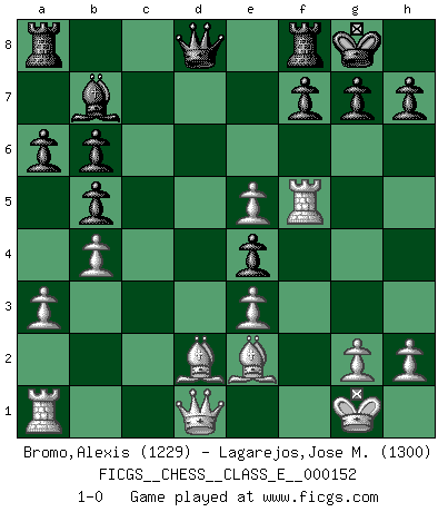 Last move : 1-0 2012 October 13 21:54:36 [Event "FICGS__CHESS__CLASS_E__000152"] [Site "FICGS"] [Date "2012.05.20"] [Round "1"] [White "Bromo,Alexis"] [Black "Lagarejos,Jose M."] [Result "1-0"] [WhiteElo "1229"] [BlackElo "1300"] 1.d4 d5 2.c4 Nf6 3.Nc3 Nc6 4.Nf3 e6 5.e3 Bb4 6.Bd2 O-O 7.a3 Ba5 8.b4 Bb6 9.c5 Ne4 10.Nxe4 dxe4 11.Ne5 Nxe5 12.dxe5 a6 13.cxb6 cxb6 14.Be2 b5 15.O-O b6 16.f4 Bb7 17.f5 exf5 18.Rxf5 1-0 This chess game has been lost on time (started : 2012.05.20 23:12:49) QGD : Marshall defense Kingside Castling by player Black (move 6) Kingside Castling by player White (move 15) Player White won this chess game. Follow this game move after move (download)Fischer is completely natural. He plays no roles. He's like a child. Very, very simple. (Zita Rajcsanyi) Ein Springer auf f6 gegen die eigene Rochadestellung ist schlimmer als ein rostiger Nagel im Knie. (Efim Bogoljubov) El Ajedrez es de 30 a 40 por ciento psicología. Uno no cuenta con esto cuando se juega contra una computadora. No lo puedo confundir. (Judith Polgar) Les échecs, c'est l'art d'analyser. (Mikhail Botvinnik) Work expands to fill the time available. (C. Northcote Parkinson, in Parkinson's Laws)