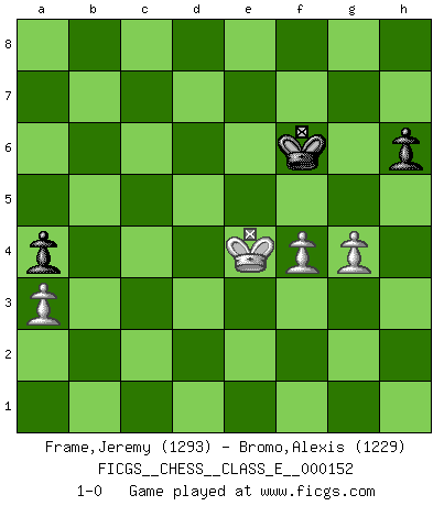 Last move : 1-0 2012 May 24 5:58:50 [Event "FICGS__CHESS__CLASS_E__000152"] [Site "FICGS"] [Date "2012.05.20"] [Round "1"] [White "Frame,Jeremy"] [Black "Bromo,Alexis"] [Result "1-0"] [WhiteElo "1293"] [BlackElo "1229"] 1.e4 c6 2.d4 d5 3.exd5 cxd5 4.Bd3 Nc6 5.c3 Nf6 6.Bf4 Bg4 7.Nf3 e6 8.O-O Bd6 9.Bxd6 Qxd6 10.Nbd2 O-O 11.h3 Bh5 12.Be2 Rfe8 13.Ne5 Bxe2 14.Qxe2 h6 15.f4 a6 16.Ndf3 Nd7 17.Rae1 f6 18.Nd3 b5 19.Qd2 a5 20.Re3 b4 21.Rfe1 bxc3 22.bxc3 f5 23.Qe2 Kf7 24.Nfe5+ Ncxe5 25.Nxe5+ Nxe5 26.Rxe5 Ra6 27.Qh5+ Kf8 28.Qg6 Qd7 29.Rxf5+ exf5 30.Rxe8+ Qxe8 31.Qxa6 Qe1+ 32.Kh2 Qxc3 33.Qd6+ Kg8 34.Qxd5+ Kh8 35.Qxf5 Qxd4 36.Qf8+ Kh7 37.a3 Qf6 38.Qxf6 gxf6 39.g4 Kg6 40.Kg3 a4 41.Kf3 f5 42.Ke3 fxg4 43.hxg4 Kf6 44.Ke4 1-0 Caro-Kann : Exchange, Rubinstein variation Kingside Castling by player White (move 8) Kingside Castling by player Black (move 10) 10 pieces endgame at move 38 : White KQPPPP , Black KPPP WHITE : King + 1 Queen 4 Pawns BLACK : King + 3 Pawns 9 pieces endgame at move 38 : White KPPPP , Black KPPP WHITE : King + 4 Pawns BLACK : King + 3 Pawns 8 pieces endgame at move 42 : White KPPP , Black KPPP WHITE : King + 3 Pawns BLACK : King + 3 Pawns 7 pieces endgame at move 43 : White KPPP , Black KPP WHITE : King + 3 Pawns BLACK : King + 2 Pawns Player White won this chess game. Follow this game move after move (download)Chess is imagination. (David Bronstein) Lisa Lane, amerikanische Schachmeisterin, hatte Fischer einmal als stärksten lebenden Spieler bezeichnet. Antwort: Das ist richtig, aber Lisa Lane ist eigentlich nicht in der Lage, das zu beurteilen. (Robert James Fischer) Te sientas frente a un tablero y repentinamente tu corazón brinca. Tu mano tiembla al tomar una pieza y moverla. Pero lo que el Ajedrez te enseña es que tu debes permanecer ahí con calma y pensar de que si realmente es una buena idea o de que si hay otras ideas mejores. (Stanley Kubrick) Aucun coup ne doit être joué sans but. (Pedro Damiano) It's not the will to win, but the will to prepare to win that makes the difference. (Bear Bryant)