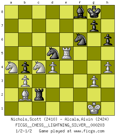 Last move : 1/2-1/2 2012 May 21 19:49:28 [Event "FICGS__CHESS__LIGHTNING_SILVER__000203"] [Site "FICGS"] [Date "2012.05.21"] [Round "1"] [White "Nichols,Scott"] [Black "Alcala,Alvin"] [Result "1/2-1/2"] [WhiteElo "2410"] [BlackElo "2424"] 1.Nf3 d5 2.d4 Nf6 3.c4 c6 4.Nc3 e6 5.e3 Nbd7 6.Qc2 Bd6 7.Bd3 O-O 8.O-O dxc4 9.Bxc4 a6 10.Rd1 b5 11.Bd3 Bb7 12.Ng5 h6 13.Nge4 Be7 14.a3 a5 15.b3 Nd5 16.Bb2 Rc8 17.Qe2 f5 18.Nd2 b4 19.axb4 axb4 20.Na4 c5 21.Ba6 Qc7 22.g3 Bxa6 23.Qxa6 Qc6 24.Qe2 Bf6 25.Nc4 Rc7 26.Qe1 cxd4 27.exd4 Re8 28.Rdc1 Bg5 29.Rc2 R7c8 30.Qe2 Rc7 31.Re1 Re7 32.Qd3 Qb5 33.Qf3 Bf6 34.Ra1 Qb8 35.R2c1 Kh7 36.Na5 Re8 37.Rxc7 Qxc7 38.Nc4 Qc6 39.h4 Ra8 40.Rc1 Qa6 41.Qe2 Re8 42.Kh2 Kg8 43.Re1 Qc6 44.Qh5 Rf8 45.Qf3 f4 46.Qg4 fxg3+ 47.fxg3 Be7 48.Qxe6+ Qxe6 49.Rxe6 Rf2+ 50.Kh1 Bf8 51.Re8 N7f6 52.Re5 Rc2 53.Kg1 1/2-1/2 Reti Opening Kingside Castling by player Black (move 7) Kingside Castling by player White (move 8) This chess game ended in a draw. Follow this game move after move (download)All Chess players should have a hobby. (Savielly Tartakower) Wenn sie aufgeben, dann danke ich Ihnen für das Spiel (Eventualzug beim Fernschach). (Anonymous) Debemos de asegurarnos de que el Ajedrez no se convierta en un lenguaje muerto, muy interesante, pero tan solo para un grupo muy pequeño. (Sytze Faber) Les erreurs sont comme les malheurs, elles n'arrivent jamais seules. (Siegbert Tarrasch) The bottom line is always the bottom line. (Johann Piek)