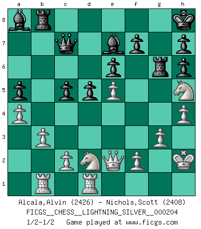 Last move : 1/2-1/2 2012 May 21 20:51:4 [Event "FICGS__CHESS__LIGHTNING_SILVER__000204"] [Site "FICGS"] [Date "2012.05.21"] [Round "1"] [White "Alcala,Alvin"] [Black "Nichols,Scott"] [Result "1/2-1/2"] [WhiteElo "2426"] [BlackElo "2408"] 1.e4 c6 2.d4 d5 3.e5 c5 4.dxc5 Nc6 5.Nf3 e6 6.Be3 Nh6 7.Bxh6 gxh6 8.Bb5 Bd7 9.O-O Bxc5 10.a4 Rg8 11.Qd3 Rg6 12.Nbd2 a6 13.Bxc6 bxc6 14.Rfd1 Qc7 15.Qe2 Kf8 16.Ne1 Rb8 17.Nd3 Be7 18.g3 c5 19.b3 Bc6 20.Nf4 Rg7 21.Nh5 Rg6 22.h3 Ba8 23.Rab1 a5 24.Kh2 Kg8 25.h4 Kh8 26.Nf4 Rg7 27.Nh5 Rg6 28.Nf4 Rg7 29.Nh5 Rg6 1/2-1/2 Caro-Kann : Advance variation Kingside Castling by player White (move 9) This chess game ended in a draw. Follow this game move after move (download)I like to say that Bobby Fischer was the greatest player ever. But what made Fischer a genius was his ability to blend an American freshness and pragmatism with Russian ideas about strategy. (Bruce Pandolfini) Habe Mut, dich deines eigenen Verstandes zu bedienen. (Immanuel Kant) Si yo gano un torneo, yo lo gano por mí mismo. Yo hago las jugadas. Nadie me ayuda. (Bobby Fischer) Même si vous avez un bon coup à faire, regardez toujours s'il n'y en a pas un qui lui soit préférable. (Pedro Damiano) History is the quarrels of popes and kings, with wars or pestilences in every page; the men all so good for nothing, and hardly any women at all. (Jane Austen)