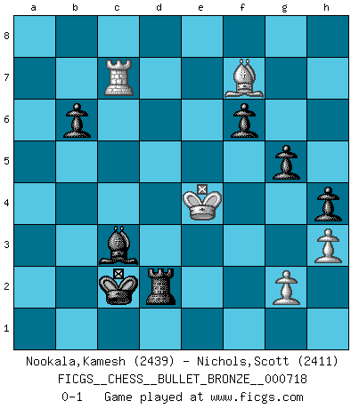 Last move : 0-1 2012 May 22 16:50:54 [Event "FICGS__CHESS__BULLET_BRONZE__000718"] [Site "FICGS"] [Date "2012.05.22"] [Round "1"] [White "Nookala,Kamesh"] [Black "Nichols,Scott"] [Result "0-1"] [WhiteElo "2439"] [BlackElo "2411"] 1.Nf3 Nf6 2.c4 g6 3.d4 Bg7 4.Nc3 O-O 5.e4 d6 6.Be2 e5 7.Be3 exd4 8.Nxd4 Re8 9.f3 c6 10.Bf2 d5 11.exd5 cxd5 12.O-O Nc6 13.c5 Bf8 14.Kh1 Bd7 15.a3 Nh5 16.Qd2 Nxd4 17.Bxd4 Bc6 18.f4 Ng7 19.Bg4 h5 20.Bf3 Nf5 21.Rad1 Rc8 22.b4 b6 23.b5 Nxd4 24.Qxd4 Bxc5 25.Qa4 Bd7 26.Rxd5 Qe7 27.Re5 Be6 28.Bc6 Red8 29.Nd5 Qd6 30.Qd1 Kg7 31.Rg5 Bxd5 32.Rxd5 Qf6 33.f5 Rxd5 34.Bxd5 Rd8 35.Qf3 g5 36.a4 h4 37.Rc1 Re8 38.Rf1 Re3 39.Qg4 Bd6 40.Bf3 Rb3 41.Bd1 Rb2 42.Qe4 Qe5 43.Qxe5+ Bxe5 44.Rf3 Kf6 45.Rf1 Rb4 46.h3 Bf4 47.Kg1 Kxf5 48.Bc2+ Kf6 49.Rf3 Rb2 50.Rf2 Ke5 51.Re2+ Kd4 52.Kf1 Be3 53.Bh7 Rb4 54.Bc2 f6 55.Ke1 Kc3 56.Bg6 Bc5 57.Rc2+ Kb3 58.a5 Rxb5 59.axb6 axb6 60.Kd2 Bb4+ 61.Kd3 Rd5+ 62.Ke4 Rd6 63.Rc7 Bc3 64.Be8 Rd2 65.Bf7+ Kc2 0-1 Reti Opening Kingside Castling by player Black (move 4) Kingside Castling by player White (move 12) Player Black won this chess game. Follow this game move after move (download)In a gambit you give up a Pawn for the sake of getting a lost game. (Samuel Standige Boden) Fischer ist das größte Genie, das je vom Schachhimmel heruntergestiegen ist. (Mikhail Nekhemyevich Tal) De eso se trata el Ajedrez. Un día le das una lección a tu oponente y al día siguiente el te da una a tí. (Bobby Fischer) Les écrivains ont utilisé les échecs pour analyser les côtés extrêmes de la nature humaine. Dans ce cadre, les échecs offrent un champ d'expérimentation idéal. Mais on pourrait faire la même chose avec la peinture. Et là, en vous référant à Van Gogh, vous ne tirerez pas de conclusion définitive sur les peintres. (Gary Kasparov) Life is verb, not a noun. (Charlotte Perkins Gilman)