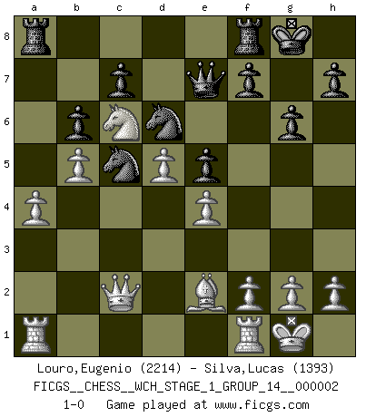 Last move : 1-0 2007 April 8 22:22:18 [Event "FICGS__CHESS__WCH_STAGE_1_GROUP_14__000002"] [Site "FICGS"] [Date "2007.01.16"] [Round "1"] [White "Louro,Eugenio"] [Black "Silva,Lucas"] [Result "1-0"] [WhiteElo "2214"] [BlackElo "1393"] 1.b4 a5 2.b5 b6 3.a4 Nf6 4.Bb2 g6 5.Nf3 Bg7 6.e4 d6 7.c4 O-O 8.Qc2 Bb7 9.d3 Nh5 10.Bxg7 Nxg7 11.d4 e5 12.dxe5 dxe5 13.Be2 Nd7 14.Nc3 Nc5 15.O-O Qe7 16.Nd5 Bxd5 17.cxd5 Rad8 18.Nd2 Ne8 19.Nc4 Nd6 20.Nxa5 Ra8 21.Nc6 1-0 This chess game has been lost on time (started : 2007.01.16 15:25:25) Polish (Sokolsky) opening Kingside Castling by player Black (move 7) Kingside Castling by player White (move 15) Player White won this chess game. Follow this game move after move (download)Fischer is an American Chess tragedy on par with Morphy and Pillsbury. (Mig Greengard) Du musst nicht gut spielen, es reicht, wenn du besser spielst als dein Gegner. (Anonymous) Todos los Maestros de Ajedrez fueron un día unos principiantes. (Chernev) Les ravages du H expliquent la différence de niveau entre Tal et Thal [Abergel]. Wisdom is the reward you get for a lifetime of listening when you'd have preferred to talk. (Doug Larson)