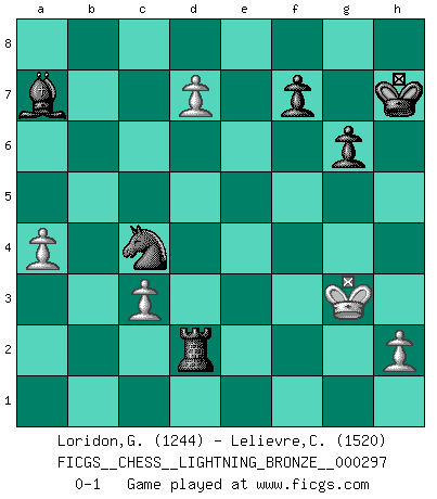 Last move : 0-1 2012 May 22 19:2:41 [Event "FICGS__CHESS__LIGHTNING_BRONZE__000297"] [Site "FICGS"] [Date "2012.05.22"] [Round "1"] [White "Loridon,Geoffroy"] [Black "Lelievre,Clement"] [Result "0-1"] [WhiteElo "1244"] [BlackElo "1520"] 1.d4 d5 2.Nc3 Nc6 3.Nf3 Nf6 4.Bg5 Qd6 5.e3 a6 6.Bxf6 exf6 7.e4 dxe4 8.Nxe4 Qb4+ 9.Qd2 Qxb2 10.Qc1 Qb4+ 11.c3 Qe7 12.Bd3 f5 13.Qg5 fxe4 14.Qxe7+ Bxe7 15.Bxe4 O-O 16.O-O Re8 17.Rab1 Ba3 18.Rfe1 Bg4 19.Rxb7 Bxf3 20.gxf3 Kf8 21.Re3 Na5 22.Rxc7 Rab8 23.Bxh7 g6 24.Re4 Rxe4 25.fxe4 Kg7 26.Ra7 Kxh7 27.Rxa6 Nc4 28.d5 Rb1+ 29.Kg2 Rb2 30.e5 Nxe5 31.d6 Bc5 32.a4 Rxf2+ 33.Kg3 Nc4 34.d7 Rd2 35.Ra7 Bxa7 0-1 Queen's pawn : Chigorin variation Kingside Castling by player Black (move 15) Kingside Castling by player White (move 16) Player Black won this chess game. Follow this game move after move (download)That's what Chess is all about. One day you give your opponent a lesson, the next day he gives you one. (Bobby Fischer) Schach ist Krieg, im Schach geht es um testosterongesteuerte Urschreie. (Garry Kasparov) ¿Cual es el objetivo de jugar una apertura de gambito?... Para adquirir una reputación de ser un jugador apuesto a costo de perder el juego. (Siegbert Tarrasch) Nous vivons dans un monde échiquéen : chaque jour qui passe est un défi à relever. (Philosophe Sasha) Wisdom begins at the end. (Daniel Webster)