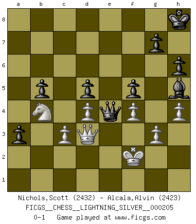 Last move : 0-1 2012 May 23 19:54:41 [Event "FICGS__CHESS__LIGHTNING_SILVER__000205"] [Site "FICGS"] [Date "2012.05.23"] [Round "1"] [White "Nichols,Scott"] [Black "Alcala,Alvin"] [Result "0-1"] [WhiteElo "2432"] [BlackElo "2423"] 1.e4 c5 2.b4 cxb4 3.a3 e6 4.Nf3 Nf6 5.e5 Nd5 6.axb4 Bxb4 7.c3 Be7 8.d4 O-O 9.Bd3 Nc6 10.O-O b6 11.Qc2 f5 12.exf6 Nxf6 13.Ng5 h6 14.Nh7 Nxh7 15.Bxh7+ Kh8 16.Bd3 d5 17.Qe2 Bd6 18.f4 Ne7 19.g3 Nf5 20.Nd2 Qc7 21.Nf3 Bd7 22.Ba3 a5 23.Ne5 Be8 24.Bxd6 Nxd6 25.Qb2 b5 26.Qa3 Kg8 27.Rae1 Rb8 28.Rb1 Rb7 29.Rf2 Qd8 30.Re2 Qb6 31.Ra2 a4 32.Rf2 Qd8 33.Qb4 Rc7 34.Ra2 Qe7 35.Bg6 Bc6 36.Re1 Bd7 37.Rae2 Be8 38.Qb2 Qf6 39.Bd3 Bh5 40.Re3 Rfc8 41.Qb4 Qd8 42.Bf1 Nf5 43.Bh3 Rb8 44.Bxf5 exf5 45.Nd3 Rc4 46.Qb2 Qc8 47.Ne5 Rc7 48.Ra1 Qb7 49.Qb4 Kh7 50.Qb1 Qc8 51.Qb2 Qe6 52.Qb1 R8b7 53.Qb2 Qc8 54.Rae1 Kh8 55.Qa3 Rb6 56.h3 Kh7 57.Qb4 Rb8 58.Qb2 Qf8 59.Nd3 Rbc8 60.Nb4 Qd6 61.Re6 Qd7 62.R6e3 Re8 63.Rxe8 Bxe8 64.Nd3 Qd8 65.Qb4 Bh5 66.Kf2 Rc4 67.Qb2 Qa5 68.Nb4 a3 69.Qb3 Qc7 70.Re3 Qa7 71.Re1 Rc8 72.Kg2 Re8 73.Rxe8 Bxe8 74.Kf2 Kh8 75.h4 Bh5 76.Qc2 Qe7 77.Qd3 Qe4 0-1 Sicilian : wing gambit, Marshall variation Kingside Castling by player Black (move 8) Kingside Castling by player White (move 10) Player Black won this chess game. Follow this game move after move (download)If your opponent cannot do anything active, then don't rush the position; instead you should let him sit there, suffer, and beg you for a draw. (Jeremy Silman) Er war ein guter Schachspieler, aber ich kann Leute nicht ausstehen, die 'Heil Hitler' rufen (Über Alexander Aljechin). (Miguel Najdorf) Cuando veas una buena jugada, trata de encontrar otra mejor. (Emanuel Lasker) Pour se monter efficace, un Cavalier a besoin d'avant-postes ! Les Cavaliers font les meilleurs bloqueurs de pions passés. The next best thing to gambling and winning is gambling and loosing. (Nick Dandalos)