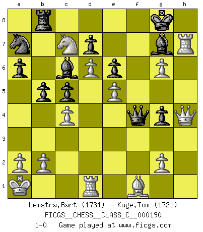 Last move : 1-0 2012 August 2 18:32:13 [Event "FICGS__CHESS__CLASS_C__000190"] [Site "FICGS"] [Date "2012.05.24"] [Round "1"] [White "Lemstra,Bart"] [Black "Kuge,Tom"] [Result "1-0"] [WhiteElo "1731"] [BlackElo "1721"] 1.d4 Nf6 2.c4 c5 3.d5 Ne4 4.Qc2 Qa5+ 5.Nc3 f5 6.f3 Nd6 7.e4 g6 8.e5 Nf7 9.f4 e6 10.d6 Nc6 11.Nf3 Bg7 12.Bd2 Qd8 13.Nb5 O-O 14.h4 b6 15.O-O-O Bb7 16.Kb1 a6 17.Nc7 Rb8 18.Bc3 Nh6 19.h5 Ng4 20.hxg6 h6 21.Qd2 Na7 22.Ka1 Qc8 23.Qe1 Bc6 24.Nh2 b5 25.Nxg4 fxg4 26.Rxh6 Qd8 27.Rh7 Rxf4 28.Bd2 Qg5 29.Bxf4 Qxf4 30.Qh4 1-0 Vulture defense Kingside Castling by player Black (move 13) Queenside Castling by player White (move 15) Player White won this chess game. Follow this game move after move (download)Examine moves that smite! A good eye for smites is far more important than a knowledge of strategical principles. (Purdy) Das Zentrum ist der Balkan des Schachbretts - Kriegshandlungen können in jedem Moment ausbrechen. (Aaron Nimzowitsch) Si el Ajedrez es una ciencia, es la mas inexacta. Si el Ajedrez es un arte, es demasiado inexacto para ser visto como tal. Si el Ajedrez es un deporte, es demasiado esotérico. Si el Ajedrez es un juego, es demasiado exigente para ser solo un juego. Si el Ajedrez es una aventura, es una muy demandante. Si el Ajedrez es una pasión, es una muy gratificante. Si el Ajedrez es la vida, es una muy triste. (Anónimo) Les échecs, c'est l'imagination. (David Bronstein) See no evil, hear no evil, speak no evil. (The 3 monkeys)