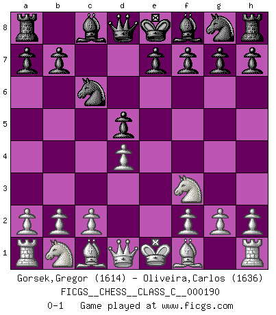 Last move : 0-1 2012 September 15 6:49:26 [Event "FICGS__CHESS__CLASS_C__000190"] [Site "FICGS"] [Date "2012.05.24"] [Round "1"] [White "Gorsek,Gregor"] [Black "Oliveira,Carlos"] [Result "0-1"] [WhiteElo "1614"] [BlackElo "1636"] 1.e4 c6 2.d4 d5 3.exd5 cxd5 4.Nf3 Nc6 0-1 This chess game has been lost on time (started : 2012.05.24 19:13:24) Caro-Kann : Exchange variation Player Black won this chess game. Follow this game move after move (download)You can only get good at Chess if you love the game. (Bobby Fischer) Schach ist eine Sache der genauen Beurteilung, wann man zuschlagen und wann man sich ducken muss. (Robert James Fischer) El jugador de combinación piensa hacia adelante; comienza de la posición dada y trabaja las movidas contundentes en su mente. (Emanuel Lasker) Le succès, c'est être capable d'aller d'échec en échec sans perdre son enthousiasme. (Winston Churchill) All art requires courage. (Anne Tucker)
