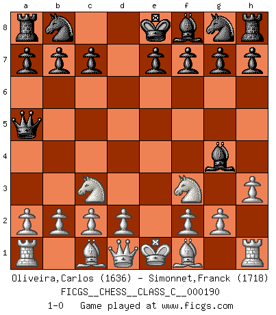 Last move : 1-0 2012 September 22 7:54:45 [Event "FICGS__CHESS__CLASS_C__000190"] [Site "FICGS"] [Date "2012.05.24"] [Round "1"] [White "Oliveira,Carlos"] [Black "Simonnet,Franck"] [Result "1-0"] [WhiteElo "1636"] [BlackElo "1718"] 1.e4 d5 2.exd5 Qxd5 3.Nc3 Qa5 4.Nf3 Bg4 5.h3 1-0 This chess game has been lost on time (started : 2012.05.24 19:13:24) Scandinavian (centre counter) defense Player White won this chess game. Follow this game move after move (download)He who takes the Queen's Knight's Pawn will sleep in the streets. (Anonymous) Ich könnte leicht behaupten: Ja,ja, Leonid Breschnew wollte nicht, daß ich Weltmeister werde. In der Tat war die Sache komplizierter. (Viktor Kortschnoi) El Ajedrez es tan interesante por sí solo, que no es necesario un interés monetario para persuadir a una persona a que lo practique; por lo tanto, nunca se juega por dinero. (Benjamin Franklin) Mais l'homme est une créature légère et illogique : semblable au joueur d'échecs, il n'aime que le processus du but à atteindre, non le but lui-même. (Dostoïevsky) The faster the computer, the slower the brain. (Thibault de Vassal)