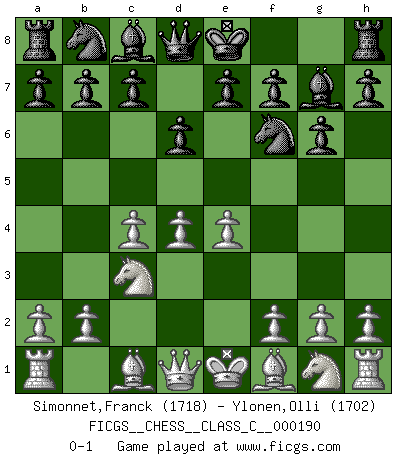 Last move : 0-1 2012 September 17 7:26:10 [Event "FICGS__CHESS__CLASS_C__000190"] [Site "FICGS"] [Date "2012.05.24"] [Round "1"] [White "Simonnet,Franck"] [Black "Ylonen,Olli"] [Result "0-1"] [WhiteElo "1718"] [BlackElo "1702"] 1.d4 Nf6 2.c4 g6 3.Nc3 Bg7 4.e4 d6 0-1 This chess game has been lost on time (started : 2012.05.24 19:13:24) King's Indian : 4.e4 Player Black won this chess game. Follow this game move after move (download)The passed Pawn is a criminal, who should be kept under lock and key. Mild measures, such as police surveillance, are not sufficient. (Aaron Nimzovich) Rubinstein ist ein Turmendspiel, welches die Götter vor tausenden von Jahren begannen. (Savielly Grigorievitsch Tartakower) Cuando veas una buena jugada, trata de encontrar otra mejor. (Emanuel Lasker) Vous n'êtes pas toujours obligé de jouer le meilleur coup. Un coup doit être actif, entreprenant, correct et beau ! (David Bronstein) If you know the enemy and know yourself you need not fear the results of a hundred battles. (Sun Tzu)