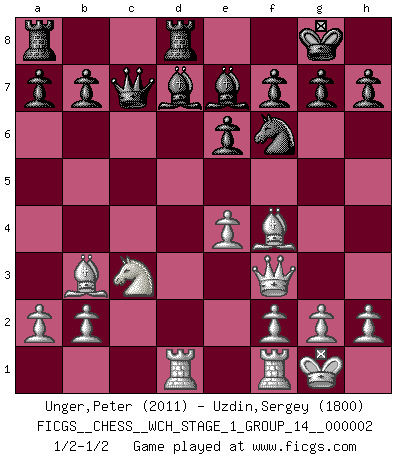 Last move : 1/2-1/2 2007 January 31 0:42:42 [Event "FICGS__CHESS__WCH_STAGE_1_GROUP_14__000002"] [Site "FICGS"] [Date "2007.01.16"] [Round "1"] [White "Unger,Peter"] [Black "Uzdin,Sergey"] [Result "1/2-1/2"] [WhiteElo "2011"] [BlackElo "1800"] 1.d4 d5 2.Nf3 Nf6 3.c4 e6 4.Nc3 Be7 5.Bg5 O-O 6.Qc2 c5 7.dxc5 dxc4 8.e4 Nc6 9.Bxc4 Nd4 10.Qd3 Nxf3+ 11.Qxf3 Qd4 12.Bb3 Qxc5 13.Be3 Qa5 14.O-O Bd7 15.Bd2 Rfd8 16.Rad1 Qc7 17.Bf4 Qa5 18.Bd2 Qc7 19.Bf4 1/2-1/2 Queen's pawn game Kingside Castling by player Black (move 5) Kingside Castling by player White (move 14) This chess game ended in a draw. Follow this game move after move (download)Nothing excites jaded Grandmasters more than a theoretical novelty. (Dominic Lawson) Versuche, dich von der Sklaverei der Eröffnungsvarianten zu befreien. Stattdessen soll man gewisse Typenpositionen erlernen, die man eingehend analysiert. (Aaron Nimzowitsch) Tu puedes aprender mucho mas de una partida que pierdas que de una partida ganada. Tendras que perder cientos de partidas antes de llegar a ser un buen jugador. (Jose Raul Capablanca) La vie et les Echecs sont tous les deux une lutte constante. (Lasker) May the force be with you. (Han Solo in Star Wars ep.4)