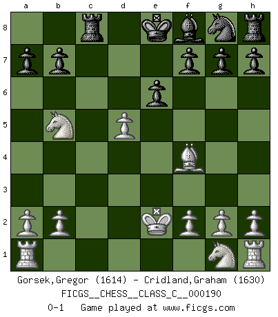 Last move : 0-1 2012 September 28 8:55:0 [Event "FICGS__CHESS__CLASS_C__000190"] [Site "FICGS"] [Date "2012.05.24"] [Round "1"] [White "Gorsek,Gregor"] [Black "Cridland,Graham"] [Result "0-1"] [WhiteElo "1614"] [BlackElo "1630"] 1.e4 c5 2.c3 Nc6 3.d4 cxd4 4.cxd4 d5 5.Nc3 dxe4 6.d5 Ne5 7.Nxe4 e6 8.Bb5+ Bd7 9.Qe2 Qa5+ 10.Nc3 Bxb5 11.Qxb5+ Qxb5 12.Nxb5 Nd3+ 13.Ke2 Nf4+ 14.Bxf4 Rc8 0-1 Sicilian : Alapin's variation (2.c3) Player Black won this chess game. Follow this game move after move (download)Chess is the art of analysis. (Mikhail Botvinnik) Frage des Reporters: -Worin besteht das Ziel von Gambiteröffnungen? Antwort: -Auf Kosten der Partie einen Ruf als Angriffspieler zu erwerben.- (Siegbert Tarrasch) Hay jugadores fuertes y personas amables y yo soy un jugador fuerte. (Bobby Fischer) Karpov est une pièce de musée. (Garry Kasparov) The real voyage of discovery consists not in seeking new lands but in seeing with new eyes. (Marcel Proust)