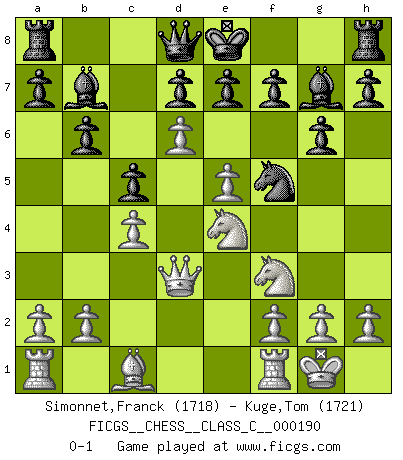 Last move : 0-1 2012 October 12 21:52:8 [Event "FICGS__CHESS__CLASS_C__000190"] [Site "FICGS"] [Date "2012.05.24"] [Round "1"] [White "Simonnet,Franck"] [Black "Kuge,Tom"] [Result "0-1"] [WhiteElo "1718"] [BlackElo "1721"] 1.d4 Nf6 2.c4 c5 3.d5 Ne4 4.Nf3 Qa5+ 5.Nbd2 Nd6 6.Qc2 g6 7.e4 Bg7 8.Bd3 Na6 9.e5 Nb4 10.Qb1 Nxd3+ 11.Qxd3 Nf5 12.O-O Qd8 13.Ne4 b6 14.d6 Bb7 0-1 Vulture defense Kingside Castling by player White (move 12) Player Black won this chess game. Follow this game move after move (download)You must take your opponent into a deep dark forest where 2+2=5, and the path leading out is only wide enough for one. (Mikhail Tal) Später, ... hatte ich zunehmend Erfolg in entscheidenden Partien. Vielleicht weil ich eine einfache Wahrheit erkannte: nicht nur ich hatte Angst, auch mein Gegner. (Mikhail Nekhemyevich Tal) El Ajedrez se juega con la mente... ¡no con las manos!. (Renaud y Kahn) Assurément je connaissais par expérience le mystérieux attrait de ce jeu royal, le seul entre tous les jeux inventés par les hommes qui échappe souverainement à la tyrannie du hasard, le seul où l'on ne doive sa victoire qu'à son intelligence ou plutôt à une certaine forme d'intelligence. Mais n'est-ce pas déjà le limiter injurieusement que d'appeler les échecs un jeu ? N'est-ce pas une science, un art ou quelque chose qui, comme le cercueil de Mahomet entre ciel et terre, est suspendu entre l'un et l'autre, et qui réunit un nombre incroyable de contraires ? [...] C'est une pensée qui ne mène à rien, une mathématique qui n'établit rien, un art qui ne laisse pas d'uvre, une architecture sans matière; et il l'a prouvé néanmoins qu'il était plus durable, à sa manière, que les livres ou que tout autre monument, ce jeu unique qui appartient à tous les peuples et à tous les temps, et dont personne ne sait quel dieu en fit don à la terre pour tuer l'ennui, pour aiguiser l'esprit et stimuler l'âme. Où commence-t-il, où finit-il ? (Stefan Zweig) The Internet is so big, so powerful and pointless that for some people it is a complete substitute for life. (Andrew Brown)