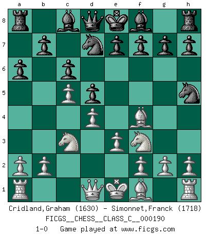Last move : 1-0 2012 September 14 18:44:57 [Event "FICGS__CHESS__CLASS_C__000190"] [Site "FICGS"] [Date "2012.05.24"] [Round "1"] [White "Cridland,Graham"] [Black "Simonnet,Franck"] [Result "1-0"] [WhiteElo "1630"] [BlackElo "1718"] 1.d4 d5 2.c4 c6 3.Nf3 Nf6 4.Nc3 a6 5.c5 Nbd7 6.Bf4 Nh5 7.e3 1-0 This chess game has been lost on time (started : 2012.05.24 19:13:24) QGD Slav : 4.Nc3 Player White won this chess game. Follow this game move after move (download)The King is a fighting piece. Use it ! (Wilhelm Steinitz) Ein Teil des Fehlers ist immer korrekt. (Savielly Grigorievitsch Tartakower) El Ajedrez moderno está demasiado preocupado con cosas como la estructura de Peones. Olvidenlo, el Jaque Mate termina la partida. (Nigel Short) Seul un grand joueur sait à quel point il joue faiblement. (Xavier Tartacover) The ego is not master in its own house. (Sigmund Freud)