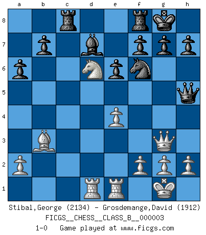 Last move : 1-0 2006 October 25 7:47:31 [Event "FICGS__CHESS__CLASS_B__000003"] [Site "FICGS"] [Date "2006.05.14"] [Round "1"] [White "Stibal,George"] [Black "Grosdemange,David"] [Result "1-0"] [WhiteElo "2134"] [BlackElo "1912"] 1.e4 c5 2.Nf3 Nc6 3.d4 cxd4 4.c3 dxc3 5.Bc4 cxb2 6.Bxb2 d6 7.O-O a6 8.Nc3 Nf6 9.Re1 e6 10.Nd4 Nxd4 11.Qxd4 Bd7 12.Rad1 Rc8 13.Bb3 Be7 14.Ne2 O-O 15.Qe3 Qa5 16.Nf4 Ng4 17.Qg3 Bf6 18.Nd3 Bxb2 19.Nxb2 Nf6 20.Nc4 Qh5 21.Nxd6 1-0 This chess game has been lost on time (started : 2006.05.14 11:15:1) Sicilian defense Kingside Castling by player White (move 7) Kingside Castling by player Black (move 14) Player White won this chess game. Follow this game move after move (download)A thorough understanding of the typical mating continuations makes the most complicated sacrificial combinations leading up to them not only not difficult, but almost a matter of course. (Siegbert Tarrasch) Der zweitbeste Zug ist oft der einzig richtige. (Savielly Grigorievitsch Tartakower) El Ajedrez te enseña a controlarl la excitación inicial que sientes cuando vez algo que parece bueno y te enseña a pensar objetivamente cuando te encuentras en problemas. (Stanley Kubrick) Seul un grand joueur sait à quel point il joue faiblement. (Xavier Tartacover) Men never do evil so completely and cheerfully as when they do it from religious conviction. (Blaise Pascal)