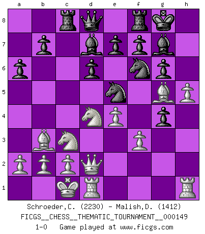 Last move : 1-0 2012 November 8 22:23:31 [Event "FICGS__CHESS__THEMATIC_TOURNAMENT__000149"] [Site "FICGS"] [Date "2012.05.26"] [Round "1"] [White "Schroeder,Christoph"] [Black "Malish,Dmitriy"] [Result "1-0"] [WhiteElo "2230"] [BlackElo "1412"] 1.e4 c5 2.Nf3 d6 3.d4 cxd4 4.Nxd4 Nf6 5.Nc3 g6 6.Be3 Bg7 7.f3 O-O 8.Qd2 Nc6 9.Bc4 Bd7 10.O-O-O Ne5 11.Bb3 Rc8 12.h4 h5 13.Bg5 a6 14.g4 hxg4 15.h5 1-0 This chess game has been lost on time (started : 2012.05.26 13:2:0) Sicilian : Dragon, Yugoslav attack, 7...O-O Kingside Castling by player Black (move 7) Queenside Castling by player White (move 10) Player White won this chess game. Follow this game move after move (download)Chess is everything: art, science and sport. (Anatoly Karpov) Ich spiele ehrlich und spiele, um zu gewinnen. Wenn ich verliere nehme ich meine Medizin. (Robert James Fischer) Fischer deseaba darle a los Rusos una sopa de su propia medicina. (Larry Evans) A chaque perte on perd un peu de soi. (Joël Lautier) The bottom line is always the bottom line. (Johann Piek)