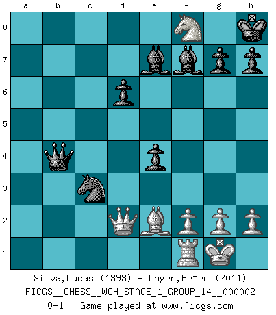 Last move : 0-1 2007 March 22 13:49:6 [Event "FICGS__CHESS__WCH_STAGE_1_GROUP_14__000002"] [Site "FICGS"] [Date "2007.01.16"] [Round "1"] [White "Silva,Lucas"] [Black "Unger,Peter"] [Result "0-1"] [WhiteElo "1393"] [BlackElo "2011"] 1.e4 c5 2.Nf3 Nc6 3.d4 cxd4 4.Nxd4 Nf6 5.Nc3 e5 6.Ndb5 d6 7.Bg5 a6 8.Na3 b5 9.Nd5 Be7 10.Bxf6 Bxf6 11.c3 O-O 12.Nc2 Bg5 13.a4 bxa4 14.Rxa4 a5 15.Bc4 Rb8 16.b3 Kh8 17.O-O f5 18.exf5 Bxf5 19.Nce3 Bg6 20.Be2 Bf7 21.Nc4 e4 22.b4 axb4 23.Ra6 Qd7 24.cxb4 Nxb4 25.Ncb6 Rxb6 26.Nxb6 Qc7 27.Ra5 Bf6 28.Rb5 Na2 29.Qd2 Nc3 30.Rb4 Qc5 31.Nd7 Qxb4 32.Nxf8 Be7 0-1 This chess game has been lost on time (started : 2007.01.16 15:25:25) Sicilian : Pelikan (Lasker/Sveshnikov) variation Kingside Castling by player Black (move 11) Kingside Castling by player White (move 17) Player Black won this chess game. Follow this game move after move (download)Chess is a sea in which a gnat may drink and an elephant may bathe. (Hindu proverb) Ich möchte Schüler heranbilden, die das Vermögen haben, selbst zu denken und Kritik zu üben. (Emanuel Lasker) El Ajedrez es un terrible juego. Si no controlas el centro, tu oponente tiene una posición mas holgada. Si tienes control del centro, ¡entonces realmente tu tienes algo de que preocuparte!. (Siegbert Tarrasch) Un footballeur joue avec ses pieds, parfois avec sa tête. Un joueur d'échecs ne joue qu'avec sa tête. Et quand il ne joue plus, il meurt. (Jacob Murray) The ultimate in disposing one's troops is to be without ascertainable shape. Then the most penetrating spies cannot pry in nor can the wise lay plans against you. (Sun Tzu)