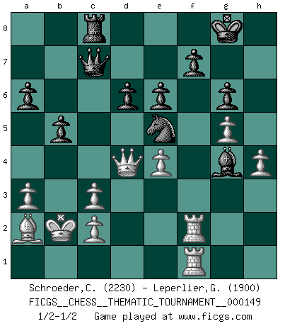 Last move : 1/2-1/2 2012 September 20 13:0:49 [Event "FICGS__CHESS__THEMATIC_TOURNAMENT__000149"] [Site "FICGS"] [Date "2012.05.26"] [Round "1"] [White "Schroeder,Christoph"] [Black "Leperlier,Gabriel"] [Result "1/2-1/2"] [WhiteElo "2230"] [BlackElo "1900"] 1.e4 c5 2.Nf3 d6 3.d4 cxd4 4.Nxd4 Nf6 5.Nc3 g6 6.Be3 Bg7 7.f3 O-O 8.Qd2 Nc6 9.Bc4 Ne5 10.Bb3 Bd7 11.O-O-O Rc8 12.h4 h5 13.Bg5 Nc4 14.Qe2 Na5 15.Kb1 a6 16.g4 hxg4 17.Bxf6 Bxf6 18.fxg4 Rxc3 19.bxc3 Qc8 20.g5 Bg4 21.Qg2 Be5 22.Rd3 Bh5 23.Ne2 Nc4 24.Ng3 Bxg3 25.Rxg3 Ne5 26.Qf2 Qc6 27.Bd5 Qc7 28.Rf1 b5 29.a3 Ng4 30.Qd4 Ne5 31.Rg2 e6 32.Ba2 Rc8 33.Rgf2 Nc6 34.Qd2 Ne5 35.Kb2 Bg4 36.Qd4 1/2-1/2 Sicilian : Dragon, Yugoslav attack, 7...O-O Kingside Castling by player Black (move 7) Queenside Castling by player White (move 11) This chess game ended in a draw. Follow this game move after move (download)There are two classes of men; those who are content to yield to circumstances and who play whist; those who aim to control circumstances, and who play Chess. (Mortimer Collins) Was ist der Unterschied zwischen einem Strassenarbeiter und einem Schachspieler? --Der Schachspieler bewegt sich ab und zu. (Anonymous) El Ajedrez por encima de todo... ¡es una pelea!. (Emanuel Lasker) Les Echecs ne sont pas pour les âmes timides. Ils requièrent un homme entier, qui ne s'arrête pas aveuglément à ce qui a été déjà établi, mais qui tente individuellement de sonder les profondeurs du jeu. (W. Steinitz) Your best chance to get a Royal Flush in a casino is in the bathroom. (Anonymous)