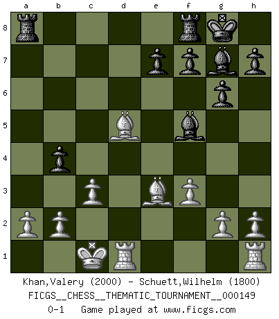 Last move : 0-1 2012 December 7 11:33:57 [Event "FICGS__CHESS__THEMATIC_TOURNAMENT__000149"] [Site "FICGS"] [Date "2012.05.26"] [Round "1"] [White "Khan,Valery"] [Black "Schuett,Wilhelm"] [Result "0-1"] [WhiteElo "2000"] [BlackElo "1800"] 1.e4 c5 2.Nf3 d6 3.d4 cxd4 4.Nxd4 Nf6 5.Nc3 g6 6.Be3 Bg7 7.f3 O-O 8.Qd2 Nc6 9.O-O-O d5 10.Nxc6 bxc6 11.exd5 cxd5 12.Nxd5 Nxd5 13.Qxd5 Qc7 14.Qc5 Qb8 15.c3 Bf5 16.Ba6 Qb6 17.Qxb6 axb6 18.Bc4 b5 19.Bd5 b4 0-1 Sicilian : Dragon, Yugoslav attack, 7...O-O Kingside Castling by player Black (move 7) Queenside Castling by player White (move 9) Player Black won this chess game. Follow this game move after move (download)There must have been a time when men were demigods, or they could not have invented Chess. (Gustav Schenk) Das typische an einem Großmeister ist, daß er eine gewonnene Position schnell und schmerzlos gewinnt. (Irving Chernev) No es una movida, aún la mejor movida que tu debas buscar, sino un plan comprensible. (Eugene Znosko-Borovsky) Vous m'avez demandé de vous exposer quel est le fondement de la prière. Je ne fais que préparer les pièces du jeu sur la table... Nous sera-t-il permis d'en adopter les règles et si nous les appliquons scrupuleusement nous ne tarderons pas à faire mat le Roi divin ! Il ne pourra échapper à nos mains. (Sainte Thérèse d'Avila, Chemin de perfection) It's only after you lost everything, Tyler says, that you're free to do anything. (Chuck Palahniuk, Fight Club)