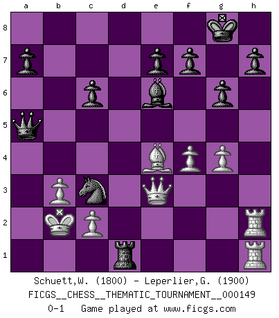 Last move : 0-1 2013 February 24 0:45:51 [Event "FICGS__CHESS__THEMATIC_TOURNAMENT__000149"] [Site "FICGS"] [Date "2012.05.26"] [Round "1"] [White "Schuett,Wilhelm"] [Black "Leperlier,Gabriel"] [Result "0-1"] [WhiteElo "1800"] [BlackElo "1900"] 1.e4 c5 2.Nf3 d6 3.d4 cxd4 4.Nxd4 Nf6 5.Nc3 g6 6.Be3 Bg7 7.f3 O-O 8.Qd2 Nc6 9.O-O-O d5 10.exd5 Nxd5 11.Nxc6 bxc6 12.Bd4 Bxd4 13.Qxd4 Be6 14.h4 Qb6 15.Na4 Qa5 16.b3 Rad8 17.Qc5 Qc7 18.Bd3 Nf4 19.h5 Rd5 20.Qf2 Nxh5 21.Nc3 Ra5 22.g4 Qf4+ 23.Kb2 Nf6 24.Rh2 Rd8 25.Rdh1 Rd7 26.Be4 Qe5 27.Qe3 Nd5 28.f4 Rxa2+ 29.Kxa2 Nxc3+ 30.Ka3 Qa5+ 31.Kb2 Rd1 0-1 Sicilian : Dragon, Yugoslav attack, 7...O-O Kingside Castling by player Black (move 7) Queenside Castling by player White (move 9) Player Black won this chess game. Follow this game move after move (download)I love all positions. Give me a difficult positional game, I will play it. But totally won positions, I cannot stand them. (Hein Donner) Es ist wirklich schade, dass so viele Schachspieler nicht auf ihr Äußeres achten! (Alexandra Kosteniuk) ¿Quién es tu oponente esta tarde? Esta tarde mi oponente son las piezas negras. (Akiba Rubinstein) Des points faibles ou des trous dans la position de l'adversaire doivent être occupés par des pièces et non pas par des pions. (Siegbert Tarrasch) The leaves of memory seemed to make a mournful rustling in the dark. (Henry Wadsworth Longfellow)