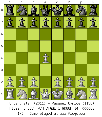 Last move : 1-0 2007 February 15 22:29:16 [Event "FICGS__CHESS__WCH_STAGE_1_GROUP_14__000002"] [Site "FICGS"] [Date "2007.01.16"] [Round "1"] [White "Unger,Peter"] [Black "Vasquez,Carlos"] [Result "1-0"] [WhiteElo "2011"] [BlackElo "1196"] 1.d4 1-0 This chess game has been lost on time (started : 2007.01.16 15:25:25) Queen's pawn Player White won this chess game. Follow this game move after move (download)We don't really know how the game was invented, though there are suspicions. As soon as we discover the culprits, we'll let you know. (Bruce Pandolfini) Die jungen Leute sollen verstehen, dass sie noch etwas von mir lernen können und müssen. (Viktor Kortschnoi) Mis oponentes también hacen buenas movidas. A veces yo no tomo esas cosas en consideración. (Bobby Fischer) Il vaut toujours mieux jouer un plan faux de façon logique que de n'avoir pas de plan du tout. (Victor Kortchnoï) There is a computer disease that anybody who works with computers knows about. It's a very serious disease and it interferes completely with the work. The trouble with computers is that you 'play' with them ! (Richard P. Feynman)