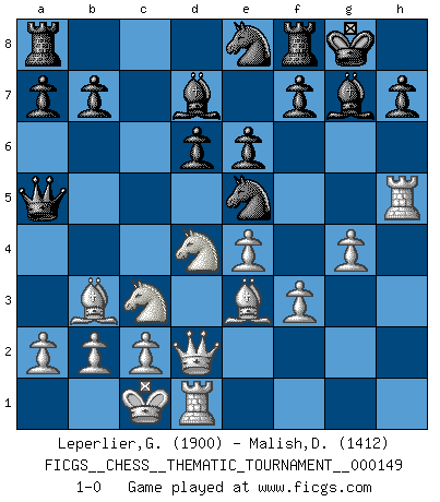 Last move : 1-0 2012 October 26 22:35:0 [Event "FICGS__CHESS__THEMATIC_TOURNAMENT__000149"] [Site "FICGS"] [Date "2012.05.26"] [Round "1"] [White "Leperlier,Gabriel"] [Black "Malish,Dmitriy"] [Result "1-0"] [WhiteElo "1900"] [BlackElo "1412"] 1.e4 c5 2.Nf3 d6 3.d4 cxd4 4.Nxd4 Nf6 5.Nc3 g6 6.Be3 Bg7 7.f3 O-O 8.Qd2 Nc6 9.Bc4 Bd7 10.h4 Ne5 11.Bb3 Qa5 12.g4 Ne8 13.h5 gxh5 14.O-O-O e6 15.Rxh5 1-0 Sicilian : Dragon, Yugoslav attack, 7...O-O Kingside Castling by player Black (move 7) Queenside Castling by player White (move 14) Player White won this chess game. Follow this game move after move (download)There is no remorse like the remorse of Chess. (H. G. Wells) Der Verteidiger gebe der Gewalt nach, aber nur der Gewalt. Er schaffe sich nicht freiwillig, etwa aus Blindheit oder aus Schrecken, irgendwelche Schwächen. Er lasse sich nicht bluffen. (Emanuel Lasker) El Ajedrez es realmente noventa y nueve por ciento calculación. (Soltis) Le pion, dans sa simplicité, marche droit devant lui, mais lorsqu'il prend, il le fait obliquement? Ainsi l'homme, tant qu'il reste pauvre, marche dans la droiture et vit honnêtement, mais lorsqu'il recherche les honneurs, il flatte, se parjure et, par les voies obliques, cherche une position supérieure sur l'échiquier du monde. (Jean de Galles) I find your interest interesting. (Gregory House, House M.D.)