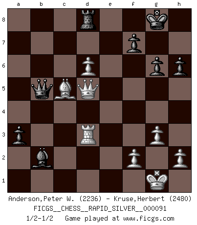 Last move : 1/2-1/2 2012 July 28 14:17:9 [Event "FICGS__CHESS__RAPID_SILVER__000091"] [Site "FICGS"] [Date "2012.05.26"] [Round "2"] [White "Anderson,Peter W."] [Black "Kruse,Herbert"] [Result "1/2-1/2"] [WhiteElo "2236"] [BlackElo "2480"] 1.d4 Nf6 2.c4 g6 3.Nc3 d5 4.Nf3 Bg7 5.cxd5 Nxd5 6.e4 Nxc3 7.bxc3 c5 8.Rb1 O-O 9.Be2 cxd4 10.cxd4 Qa5+ 11.Bd2 Qxa2 12.O-O Bg4 13.Bg5 h6 14.Be3 Nc6 15.d5 Bxf3 16.Bxf3 Ne5 17.Rxb7 a5 18.Be2 Nc4 19.Rxe7 Qa3 20.Bxc4 Qxe7 21.d6 Qxe4 22.Bd5 Qb4 23.Bxa8 Rxa8 24.Qd5 Rd8 25.Bc5 Qb5 26.Rd1 a4 27.g3 Bb2 28.Rd3 a3 1/2-1/2 King's Indian defense, 3.Nc3 Kingside Castling by player Black (move 8) Kingside Castling by player White (move 12) This chess game ended in a draw. Follow this game move after move (download)If your opponent offers you a draw, try to work out why he thinks he's worse off. (Nigel Short) Wie, soll nun auch die Opposition abgeschafft werden? Ja, es tut mir leid, Ihnen diesen Schmerz nicht ersparen zu können. (Aaron Nimzowitsch) Debes de llevar a tu oponente hacia un profundo y obscuro bosque donde 2+2=5, y el camino que conduce a la salida es suficientemente ancho para solamente uno. (Mikhail Tal) A chaque perte on perd un peu de soi. (Joël Lautier) But they are useless. They can only give you answers. (Pablo Picasso, about computers)