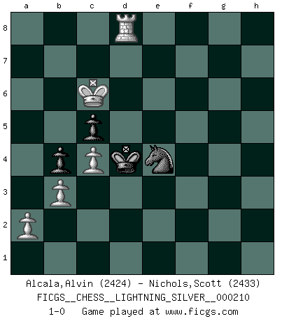 Last move : 1-0 2012 May 27 21:6:15 [Event "FICGS__CHESS__LIGHTNING_SILVER__000210"] [Site "FICGS"] [Date "2012.05.27"] [Round "1"] [White "Alcala,Alvin"] [Black "Nichols,Scott"] [Result "1-0"] [WhiteElo "2424"] [BlackElo "2433"] 1.e4 e5 2.Nf3 Nc6 3.Bb5 Nf6 4.O-O Nxe4 5.d4 Nd6 6.Bxc6 dxc6 7.dxe5 Nf5 8.Qxd8+ Kxd8 9.Nc3 Ke8 10.b3 b6 11.Bb2 Bb7 12.Rad1 Be7 13.Ne2 c5 14.Nc3 Bxf3 15.gxf3 Nd4 16.Nd5 Ne6 17.f4 g6 18.Kg2 c6 19.Nf6+ Bxf6 20.exf6 Nxf4+ 21.Kg3 Ne6 22.Rd6 Rd8 23.Rfd1 Rxd6 24.Rxd6 Nd8 25.f4 Rg8 26.Rd2 Ne6 27.Kf3 Nf8 28.Bc3 h6 29.Bb2 Nd7 30.Re2+ Kd8 31.Re7 Rf8 32.Kg4 Kc8 33.h4 b5 34.c4 Kc7 35.h5 Kc8 36.Ba1 Kd8 37.Bc3 b4 38.Bb2 a5 39.Be5 gxh5+ 40.Kh4 Re8 41.Bc7+ Kxc7 42.Rxe8 Nxf6 43.Rf8 Kd7 44.Rxf7+ Ke6 45.Ra7 Kf5 46.Rxa5 Ne4 47.Kxh5 Kxf4 48.Ra6 Ke3 49.Rxc6 Kd4 50.Rxh6 Kc3 51.Re6 Kd4 52.Kg4 Nc3 53.Ra6 Ke4 54.Ra5 Kd4 55.Kf5 Nd1 56.Ra8 Nc3 57.Ke6 Ke4 58.Kd6 Kd4 59.Kc6 Ne4 60.Rd8+ 1-0 Ruy Lopez : Berlin defense, Open variation Kingside Castling by player White (move 4) 10 pieces endgame at move 49 : White KRPPP , Black KNPPP WHITE : King + 1 Rook 3 Pawns BLACK : King + 1 Knight 3 Pawns 9 pieces endgame at move 50 : White KRPPP , Black KNPP WHITE : King + 1 Rook 3 Pawns BLACK : King + 1 Knight 2 Pawns Player White won this chess game. Follow this game move after move (download)Avoid the crowd. Do your own thinking independently. Be the Chess player, not the Chess piece. (Ralph Charell) Ein Schachgenie ist jemand der verdammt gut Schach spielt. (Jonathan Levitt) Siempre es mucho mejor sacrificar las piezas de tu oponente. (Savielly Tartakover) Horreur, mais aussi harmonie suprême : qu'y avait-il en effet au monde en dehors des échecs ? Le brouillard, l'inconnu, le non-être... (Vladimir Nabokov) They say poker is a zero-sum game. It must be, because every time I play my sum ends up zero. (Max Shapiro)