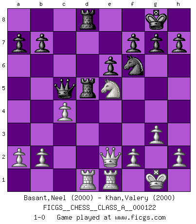 Last move : 1-0 2012 December 2 23:28:21 [Event "FICGS__CHESS__CLASS_A__000122"] [Site "FICGS"] [Date "2012.05.28"] [Round "1"] [White "Basant,Neel"] [Black "Khan,Valery"] [Result "1-0"] [WhiteElo "2000"] [BlackElo "2000"] 1.e4 c5 2.c3 d5 3.exd5 Qxd5 4.Nf3 Bg4 5.Be2 Nf6 6.O-O Nc6 7.d4 e6 8.Be3 cxd4 9.Nxd4 Bxe2 10.Qxe2 Rd8 11.Nxc6 Qxc6 12.Bd4 Nd5 13.Qf3 Nb4 14.Qe2 Nd5 15.Nd2 Bc5 16.Bxc5 Qxc5 17.g3 Nf6 18.Nf3 O-O 19.Rad1 Rfe8 20.Rfe1 Rd5 21.Ne5 Red8 22.c4 1-0 Sicilian : Alapin's variation (2.c3) Kingside Castling by player White (move 6) Kingside Castling by player Black (move 18) Player White won this chess game. Follow this game move after move (download)If Chess is a science, it's a most inexact one. If Chess is an art, it is too exacting to be seen as one. If Chess is a sport, it's too esoteric. If Chess is a game, it's too demanding to be just a game. If Chess is a mistress, she's a demanding one. If Chess is a passion, it's a rewarding one. If Chess is life, it's a sad one. (Unknown) Versuche, dich von der Sklaverei der Eröffnungsvarianten zu befreien. Stattdessen soll man gewisse Typenpositionen erlernen, die man eingehend analysiert. (Aaron Nimzowitsch) Es el objetivo de la escuela moderna no tratar cada posición de acuerdo a una regla general, sino de acuerdo al principio inherente en la posición. (Richard Reti) Une platitude souvent récitée à propos des Echecs est qu'une des choses les plus difficiles à réaliser est de gagner une position gagnante. Cela ne manque pas de sens mais, pour ma part, j'ai toujours trouvé plus difficile de gagner une position perdante. (Tim Krabbe) Convictions are more dangerous enemies of truth than lies. (Friedrich Nietzsche)