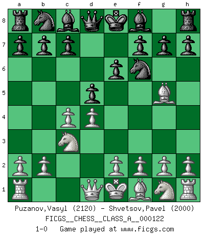 Last move : 1-0 2012 October 18 10:1:35 [Event "FICGS__CHESS__CLASS_A__000122"] [Site "FICGS"] [Date "2012.05.28"] [Round "1"] [White "Puzanov,Vasyl"] [Black "Shvetsov,Pavel"] [Result "1-0"] [WhiteElo "2120"] [BlackElo "2000"] 1.d4 d5 2.c4 e6 3.Nc3 Nf6 4.Bg5 1-0 This chess game has been lost on time (started : 2012.05.28 2:3:30) QGD : 4.Bg5 Player White won this chess game. Follow this game move after move (download)I'm not a materialistic person, in that, I don't suffer the lack or loss of money. The absence of worldly goods I don't look back on. For Chess is a way I can be as materialistic as I want without having to sell my soul. (Jamie Walter Adams) Wenn ich einen Club besuche, sind die Spieler stumm vor Staunen. (José Raúl Capablanca) Cuando tu no sabes absolutamente que mas hacer, es tiempo de entrar en pánico. (John van der Wiel) Aux échecs, les retours au sommet sont rares : les dommages psychologiques consécutifs à une défaite sont trop sévères. (Daily Telegraph) Internal peace cannot coexist with external war. (Don Groves)