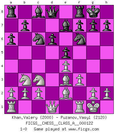 Last move : 1-0 2012 September 13 23:53:59 [Event "FICGS__CHESS__CLASS_A__000122"] [Site "FICGS"] [Date "2012.05.28"] [Round "1"] [White "Khan,Valery"] [Black "Puzanov,Vasyl"] [Result "1-0"] [WhiteElo "2000"] [BlackElo "2120"] 1.e4 c5 2.Nf3 d6 3.d4 cxd4 4.Nxd4 Nf6 5.Nc3 a6 6.Be2 e5 7.Nb3 Be7 8.O-O Nc6 9.Be3 O-O 10.f3 1-0 Sicilian : Najdorf, Opovcensky variation Kingside Castling by player White (move 8) Kingside Castling by player Black (move 9) Player White won this chess game. Follow this game move after move (download)Fischer is an American Chess tragedy on par with Morphy and Pillsbury. (Mig Greengard) Was ist der Unterschied zwischen einem Strassenarbeiter und einem Schachspieler? --Der Schachspieler bewegt sich ab und zu. (Anonymous) Todo se encuentra en un estado de flujo y esto incluye al mundo del Ajedrez. (Mikhail Botvinnik) Les Echecs sont affaire de jugement sensible. Savoir quand frapper et quand esquiver. (Fischer) All the biggest technological inventions created by man - the airplane, the automobile, the computer - says little about his intelligence, but speaks volumes about his laziness. (Mark Kennedy)