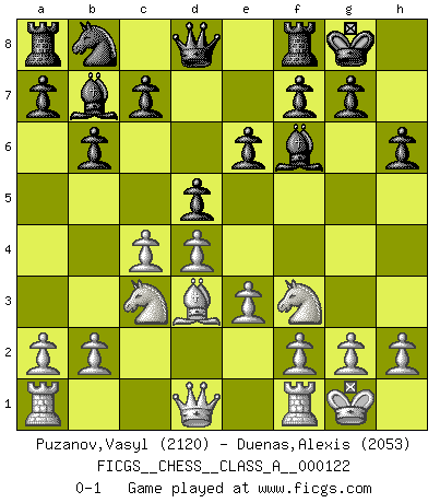 Last move : 0-1 2012 September 11 18:20:1 [Event "FICGS__CHESS__CLASS_A__000122"] [Site "FICGS"] [Date "2012.05.28"] [Round "1"] [White "Puzanov,Vasyl"] [Black "Duenas,Alexis"] [Result "0-1"] [WhiteElo "2120"] [BlackElo "2053"] 1.d4 d5 2.c4 e6 3.Nc3 Nf6 4.Bg5 Be7 5.e3 O-O 6.Nf3 h6 7.Bxf6 Bxf6 8.Bd3 b6 9.O-O Bb7 0-1 This chess game has been lost on time (started : 2012.05.28 2:3:30) QGD : Neo-Orthodox variation, 7.Bxf6 Kingside Castling by player Black (move 5) Kingside Castling by player White (move 9) Player Black won this chess game. Follow this game move after move (download)There are tough players and nice guys, and I'm a tough player. (Bobby Fischer) Nicht daß Diemer aus Opportunismus Mitglied der NSDAP geworden wäre. Er war ein Fanatiker, in allem, was er tat. (Hans Ree) Los Peones son nacidos libres, y aún así, se encuentran por doquier encadenados. (Rick Kennedy) Les échecs, c'est la lutte contre l'erreur. (Johannes Zukertort) The smarter you play, the luckier you'll be. (Mark Pilarski)