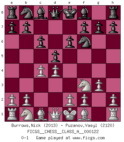 Last move : 0-1 2012 October 18 22:3:47 [Event "FICGS__CHESS__CLASS_A__000122"] [Site "FICGS"] [Date "2012.05.28"] [Round "1"] [White "Burrows,Nick"] [Black "Puzanov,Vasyl"] [Result "0-1"] [WhiteElo "2013"] [BlackElo "2120"] 1.d4 d5 2.c4 e6 3.Nf3 Nf6 4.g3 c6 0-1 This chess game has been lost on time (started : 2012.05.28 2:3:30) Queen's gambit declined Player Black won this chess game. Follow this game move after move (download)You must take your opponent into a deep dark forest where 2+2=5, and the path leading out is only wide enough for one. (Mikhail Tal) Wer nie einen Fehler gemacht hat, hat nie etwas Neues ausprobiert. (Albert Einstein) El Ajedrez, como cualquier otra actividad creativa, puede existir solo a través de méritos combinados de aquellos que tienen talento creativo y de aquellos que tienen la habilidad de organizar un trabajo creativo. (Mikhail Botvinnik) Le pion, dans sa simplicité, marche droit devant lui, mais lorsqu'il prend, il le fait obliquement? Ainsi l'homme, tant qu'il reste pauvre, marche dans la droiture et vit honnêtement, mais lorsqu'il recherche les honneurs, il flatte, se parjure et, par les voies obliques, cherche une position supérieure sur l'échiquier du monde. (Jean de Galles) Art disturbs, science reassures. (Georges Braque, Le Jour et la Nuit)